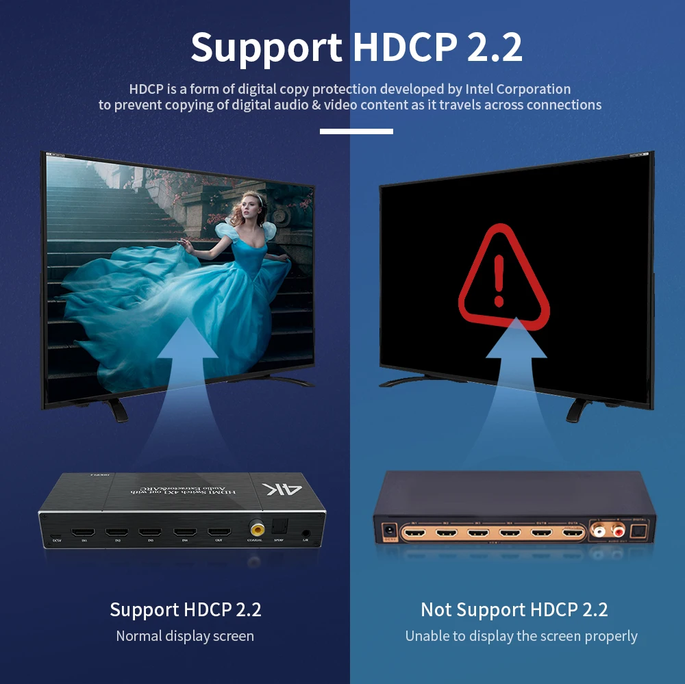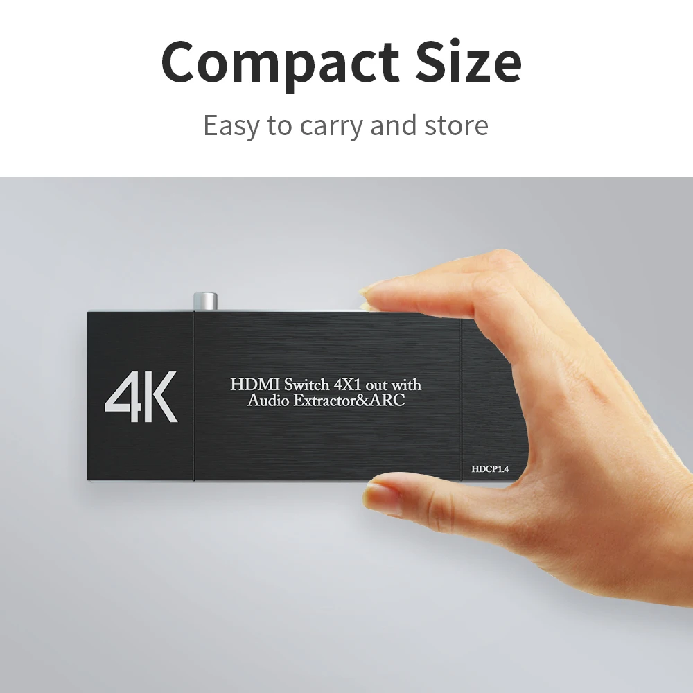 4x1 HDMI Switch: There is a high performance 4 HDMI input and 1 output switcher. Toslink output support ARC audio return control function, 3.5mm Jack output support audio extract function. Creating a superb picture quality and seamless sound. NO lag, NO flash or drop in resolution. ➤ Remote control: Gives users complete control over the selection of sources and make device incredibly friendly. ➤ Wild compatibility: Compatible with any HDMI device such as PS4/ Roku/ Fire TV/ Blu-ray players/HD TV /HD Project; ➤ HDMI ARC adapter: Extractor the Audio from TV to Soundbar or Amplifier. Connect your TV HDMI(ARC) Port to this switch HDMI Output Port with HDMI Cable, then optical cable to the soundbar, Speaker,home theater, AV receivers etc. ➤ Wild applicability:Compatible with any HDMI devices such as Nintendo Switch, PS4 Pro, Xbox 360, PS3, Beamer, DVB Receivers, Blu-ray Player, Apple TV 4, Laptop and HDTV/HD Monitor etc. Features and specifications: -Input: HDMI x 4 -Output: HDMI x 1(Female type) -Toslink x 1 Audio output, 3.5mm L/R x 1Audio output, Coaxial x 1Audio output -Coaxial and Toslink port output support ARC. (Note:3.5mm audio port not support ARC function). -support 480i/480p/576i/576p720p@50/60Hz/1080p@50/60Hz/4Kx2K@20/30Hz with 24 bit RGB/ YcbCR 4:4:4/YcbCR 4:2:2 (4k@60hzYUV4:2:0). - Compliant with HDMI2.0 , HDCP1.4/1.3/1.2/ 1.1 - Dimensions: 57MM x25MM x170MM -Package 1x 4 Port HDMI Switch 1x Remote Controller 1x User Manual 1x 5V/1A DC Power Adapter 1x Neutral Packing -Note You should operate it properly when the switch is working, lf you find the switch is not working, we suggest you unplug the power supply and plug it again.