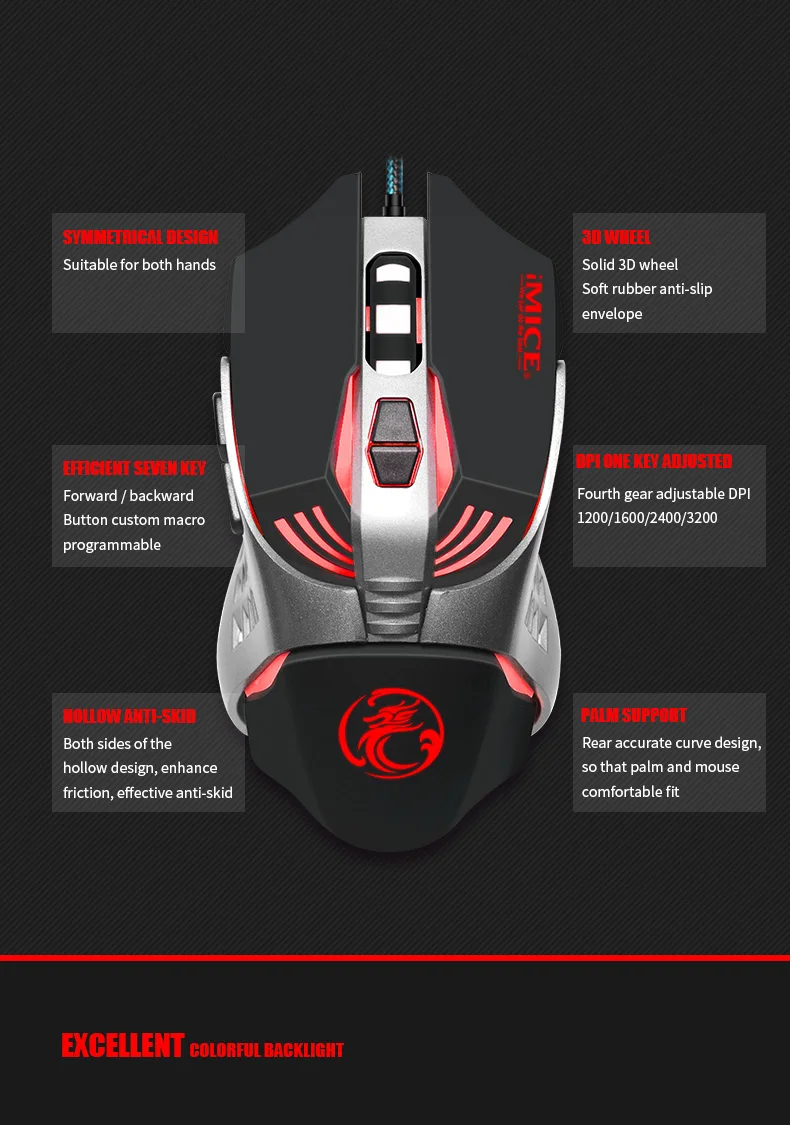 Hongsund RGB Проводная игровая мышь с разрешением для макросъемки USB 6 кнопок 4800DPI