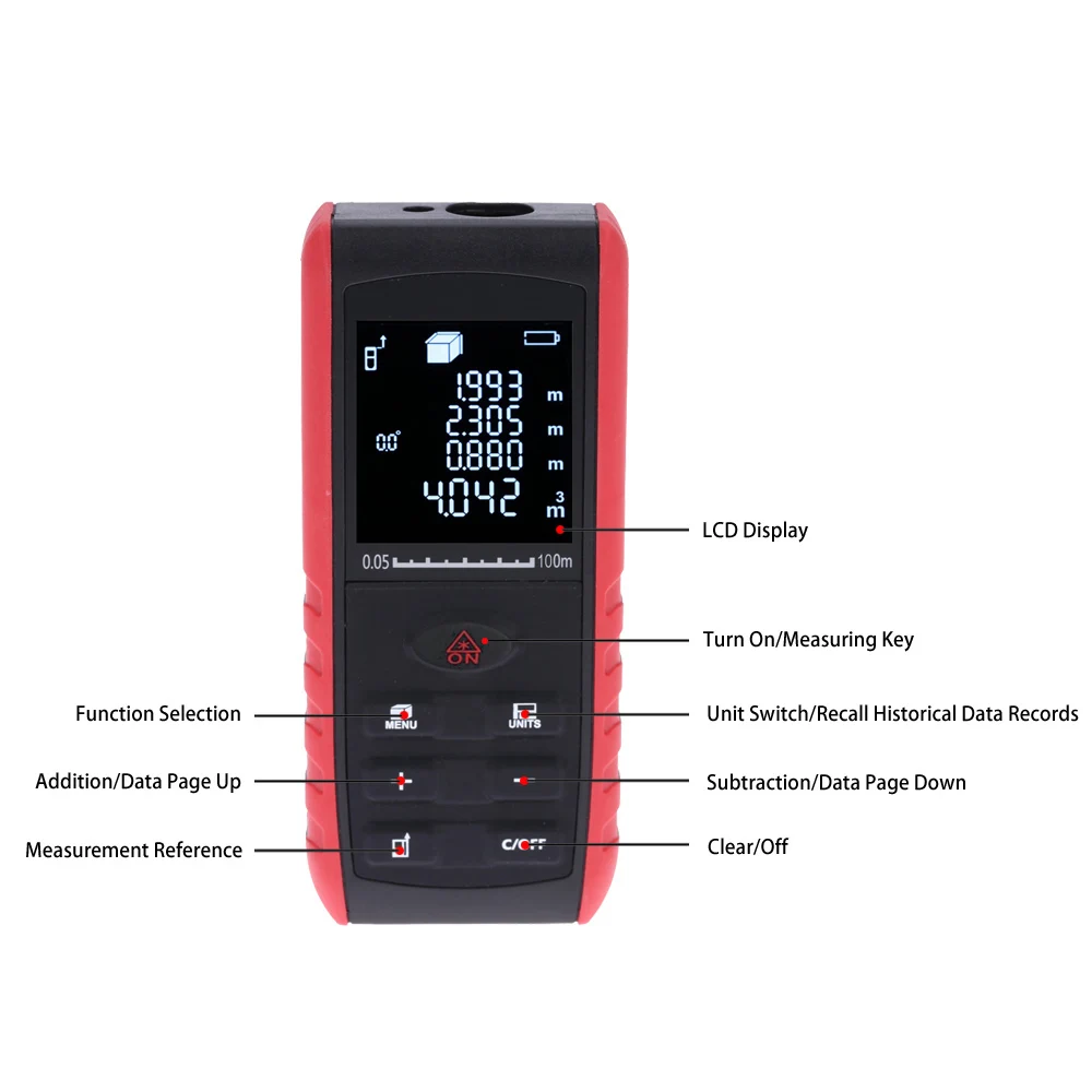 Лазерный дальномер с высокой точностью может использоваться для измерения расстояния, площади и объема. Он также используется для непрямого измерения по теореме Пифагора. Продукт является портативным и надежным в измерении, что делает ваши измерения более точными, простыми и быстрыми. Счетчик может быть широко использован в строительстве и промышленности, особенно в больших областях, таких как комнаты, квартиры, здания, недвижимость, фабрики и т. Д.