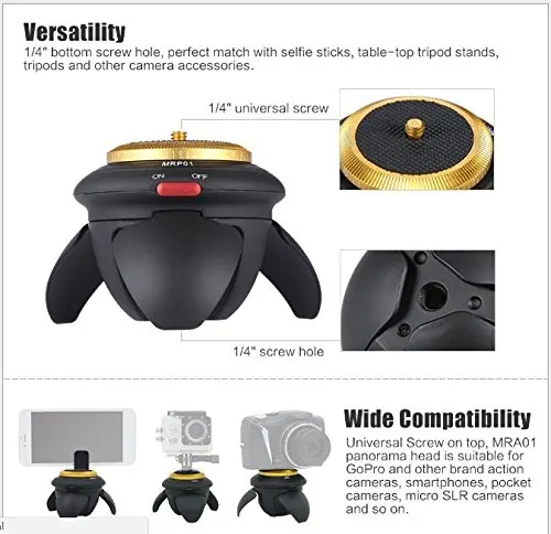 Широкий Совместимость: С универсальным винтом 1/4 "сверху, MRA01 панорамная головка подходит для экшн-камер GoPro и других брендов, смартфонов, карманных камер, микро зеркальных камер и так далее.