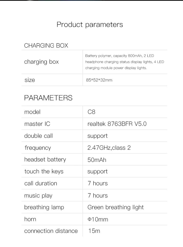 Уважаемый клиент, наш магазин поддерживает прямую доставку, если у вас есть какие-либо проблемы, пожалуйста, сообщите нам, мы сделаем все возможное, чтобы помочь вам иметь приятное сотрудничество! Искренне Спецификация: 1. Bluetooth: Raychem 8763BFR 5,0 2. Двойной вызов: поддержка 3. Частота: 2,47 ГГц, класс 2 4. Аккумулятор для наушников: 50 мАч 5. Аккумулятор зарядного отсека: 800 мАч 6. Время работы в режиме разговора: 7 часов 7. Воспроизведение музыки: 7 часов 8. Динамик: динамик 9. Расстояние соединения: 15 м/49,2 фута 10. Размер продукта: 85*52*32 мм/3,3*2,0 * 1.3in 11. Цвет: черный, красный посылка, список пар наушников * 1 Зарядная коробка * 1 Инструкция по эксплуатации * 1 USB кабель для передачи данных * 1