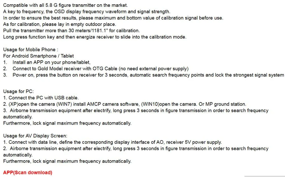 Характеристика: 1. Датчик изображения: 1/4 "CMOS датчик 2 2. Горизонтальная: 800TVL 3. ТВ система: PAL 4. Мощность Вход AC/DC 2,5-5,5 V 5. Диапазон частот: 5,8 Г 6. Мощность передачи: 25 МВт 7. Потребляемая мощность: 300 мА 8. Канал: 48CH 9. Размер: 18*14,5 мм 10. Вес нетто: 3,9 г (больше или меньше) 11. Объектив: специальный объектив, FOV 170 12. Соотношение сторон: только 4:3