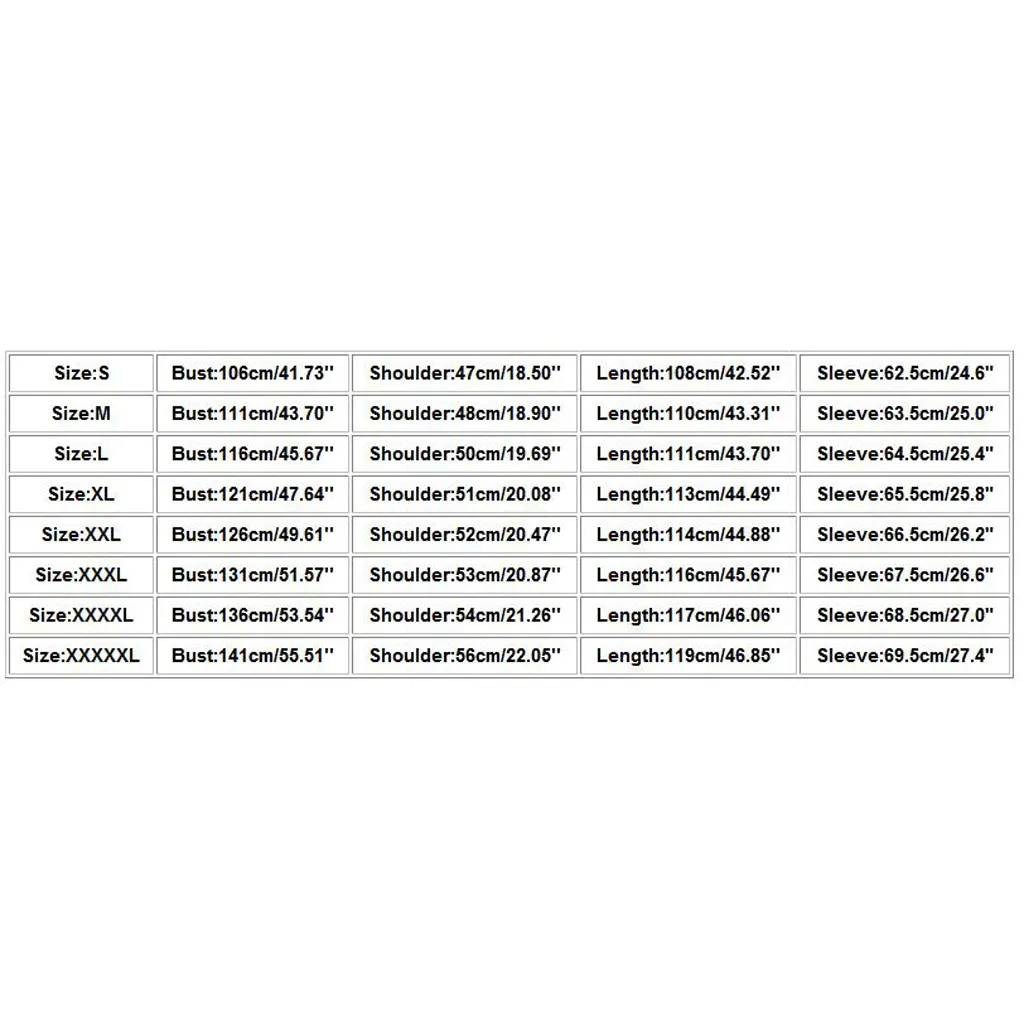 | Размеры: XXXXXL | Бюст: 141 см/55,51 дюйма | Ширина плеч: 56 см/22,05 дюйма | Длина: 119 см/46,85 дюйма | Рукав: 69,5 см/27,4" |