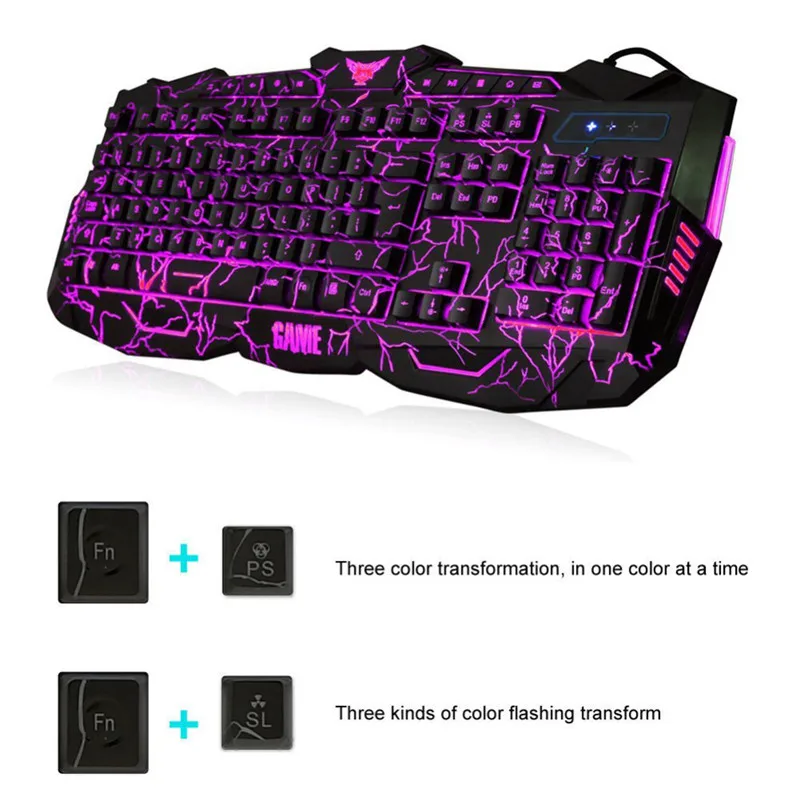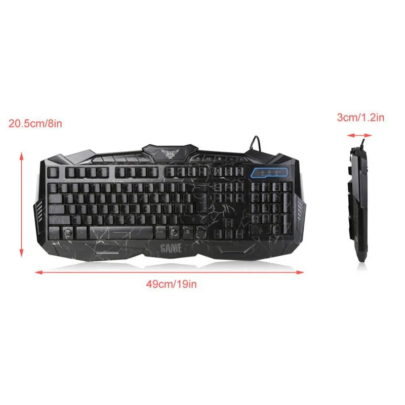 Светодиодный игровой провод 2,4G Клавиатура и мышь набор компьютерный мультимедийный геймер Клавиатура Особенности: Материал: Пластик Эксклюзивная охлаждающая игровая клавиатура обеспечивает наиболее комфортную игровую среду. Тонкий эргономичный дизайн, самый тонкий touch.19 клавиш без прорыва. Противоскользящий, с подставкой, вы можете регулировать высоту клавиатуры. Keycap с помощью лазерной гравировки, прочный износ не выцветает. Со светодиодной подсветкой, даже ночью, чтобы испытать игру, достаточно подходит. Больше больших дренажных отверстий, которые должны быть спроектированы на спине, это водонепроницаемый дизайн. Уникальный s-образный эргономичный дизайн, может эффективно уменьшить усталость и повысить комфорт. Эксклюзивный дизайн для игры, эргономичный дизайн, удобный для захвата и использования. Верхняя и нижняя крышка и колпачки изготовлены из высокопрочного АБС-пластика, могут быть эффективным анти-воздействию и анти-бита частоты использования для высокоинтенсивных геймеров. Особенность: светодиодный 3 цвета, трещина клавиатуры, 19 клавиш не коллизии Размер: 49,0 см * 20,5*3,0 см/19,0 "* 8,0" * 1,2" Длина кабеля клавиатуры: 1,5 м/59,06 дюйма Мышь Технические характеристики: Материал: АБС-пластик Система отслеживания: оптический Номинальное напряжение/электрический ток: 5 В постоянного тока/100 мА Тип подключения: проводной Длина кабеля: прибл. 140 см Порты и разъёмы: USB 2,0 Dpi: 1200/1600/2400 dpi Срок службы переключателя: 10 миллионов циклов Кнопки: слева, справа, колесо прокрутки, dpi, огненный ключ, вперед, вылет Световой эффект: красочный Система поддержки: Windows 7/8/10/2000/XP/Vista Mac OS или последняя Примечание: 1. Возможны отклонения в 1-3 мм из-за ручного измерения. Перед размещением заказа, пожалуйста, внимательно ознакомитесь со всеми условиями. Посылка включает в себя: 1 pc клавиатуры(С розничной упаковкой) 1 шт. Мышь