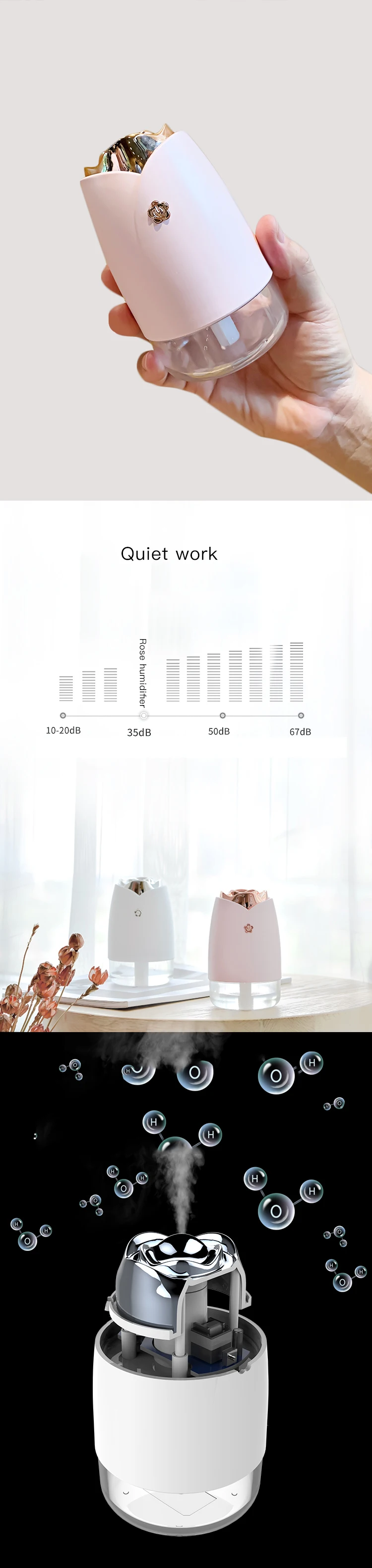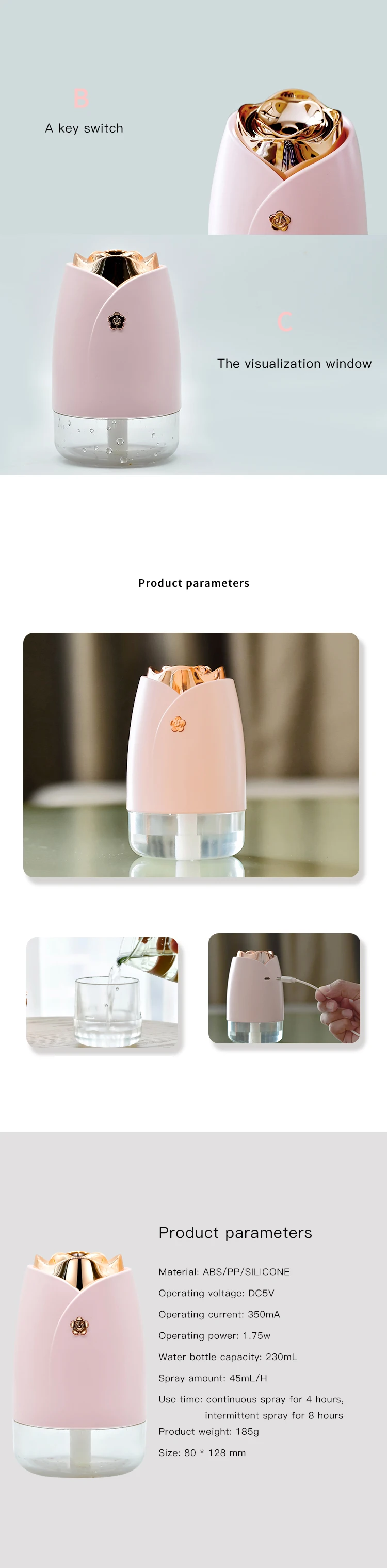 Название продукта: увлажнитель розы Цвет изделия: белый/синий/розовый Материал изделия: АБС/ПП/силикон Рабочее напряжение: DC5V Рабочий ток: 350mA Рабочая мощность: 1,75 w Емкость бутылки для воды: 230 мл Количество распыления: 45 мл/ч Время использования: непрерывный спрей в течение 4 часов, прерывистый спрей в течение 8 часов