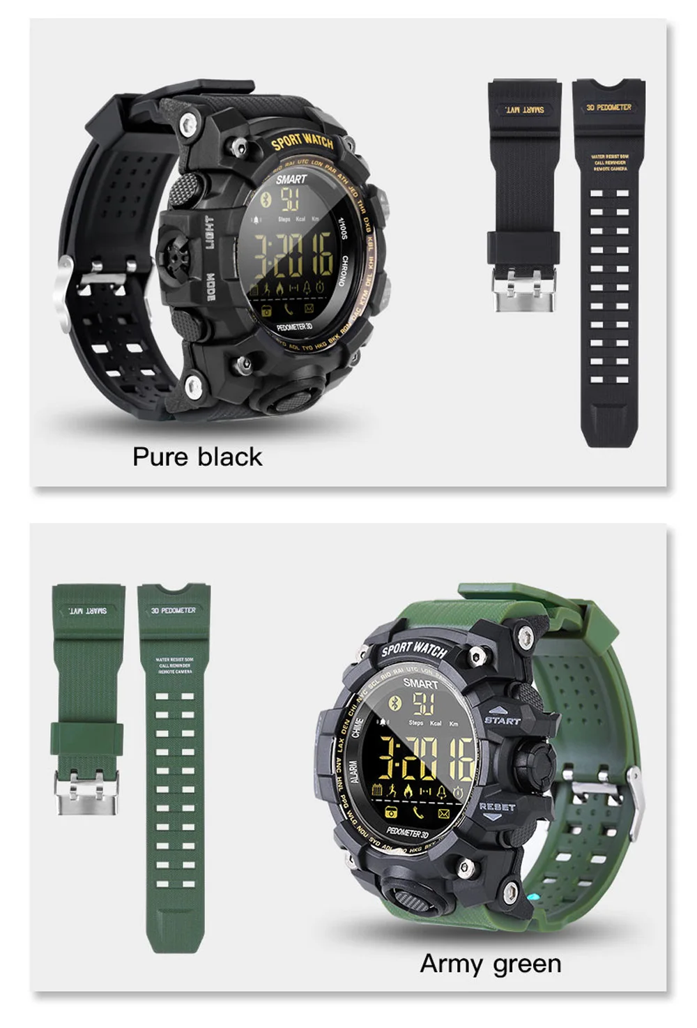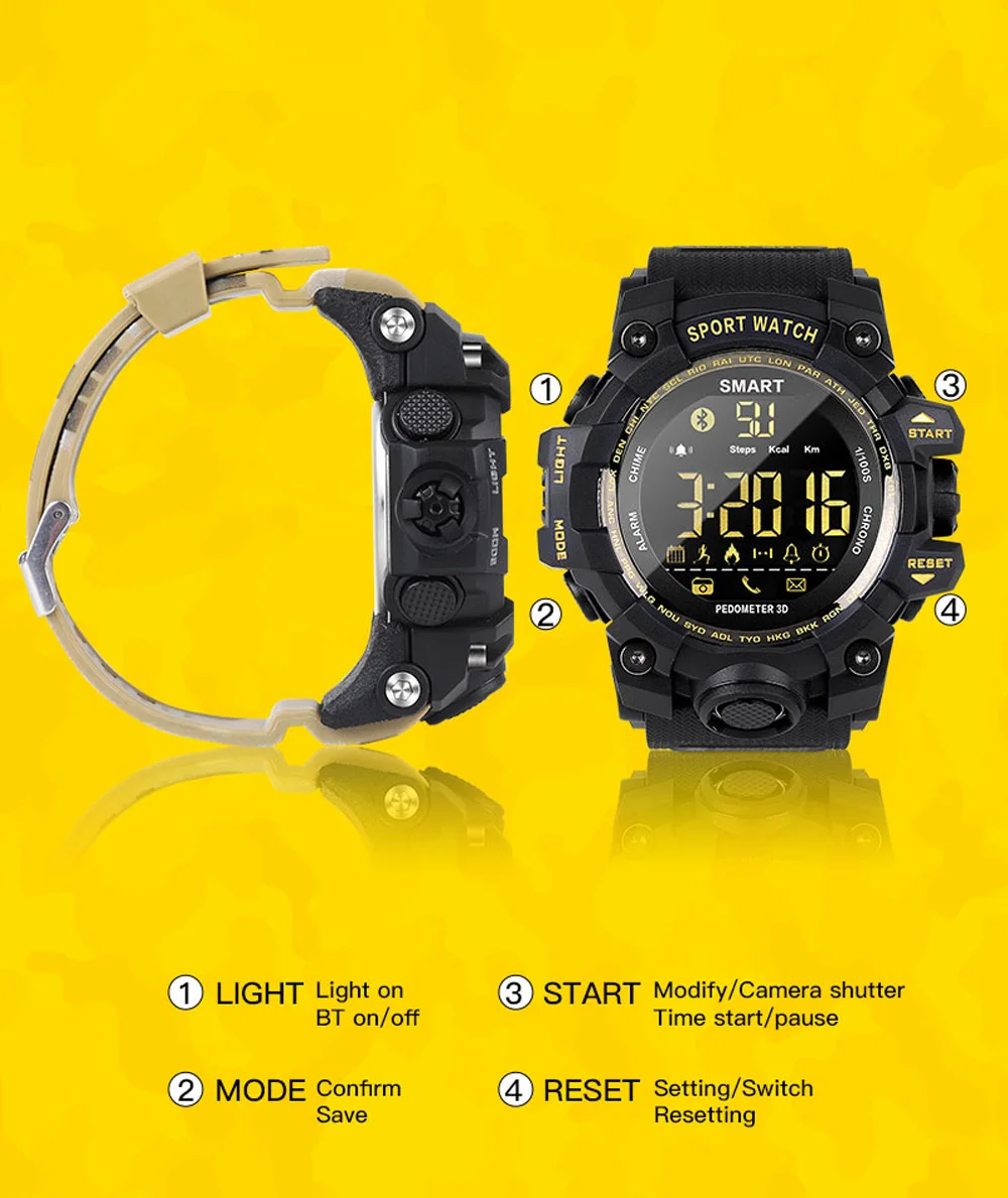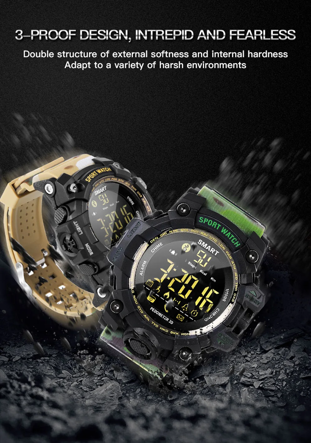 Экран Размеры: 1,8'' Экран материал-суперскрученные нематические элементы Версия Bluetooth: BLE4.0 Емкость аккумулятора: 220 мАч Время работы в режиме ожидания: 8 месяцев Размер изделия: прибл. 55*53*17 мм Размер ремешка: L (подходит для окружности запястья 160-180 мм) Вес нетто: прибл. 70 г Память: 256 + 64 Кб Материал ремешка часов: ТПУ Цвет: черный, зеленый, камуфляжный зеленый, камуфляжный желтый