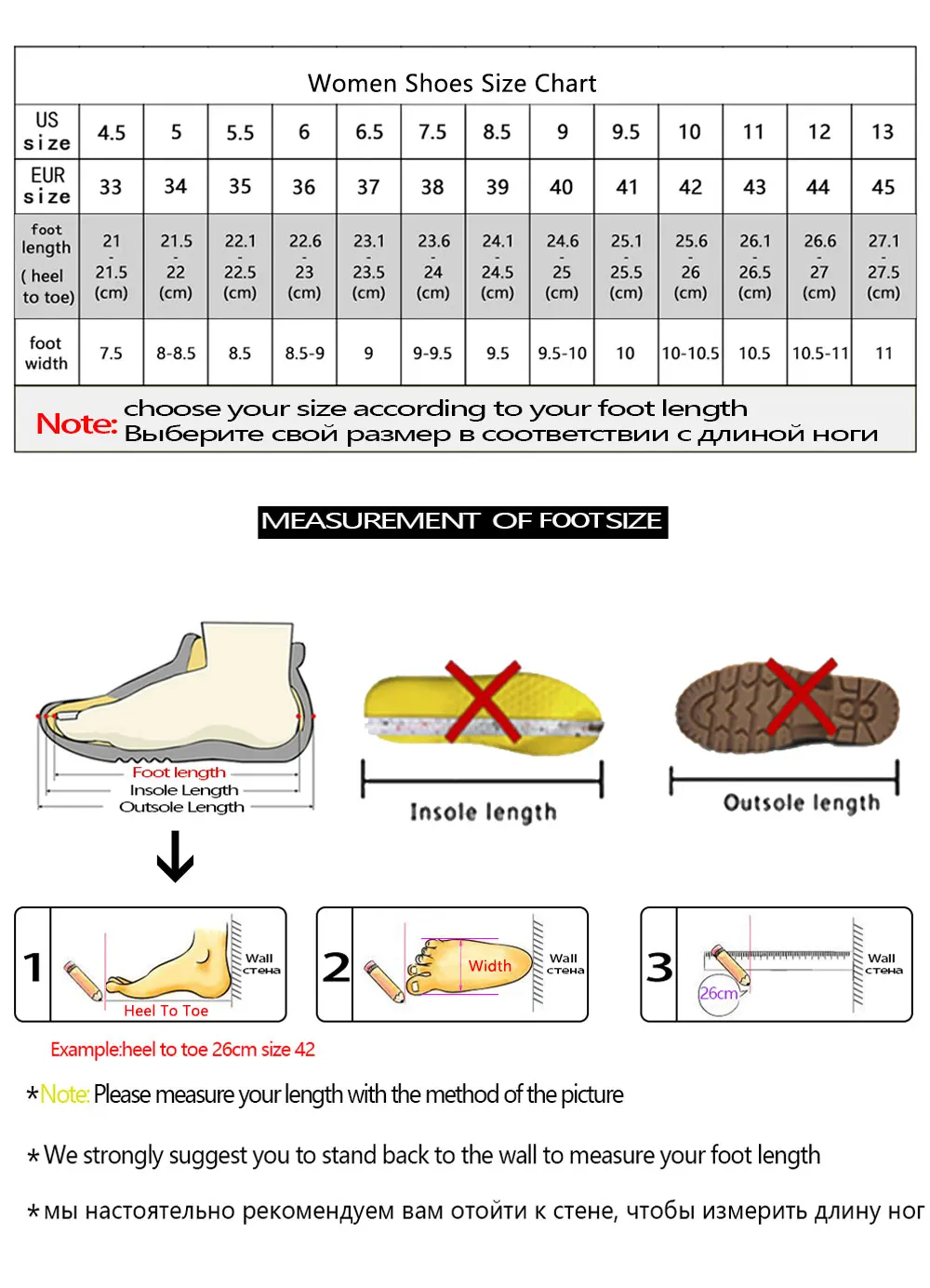 1. пожалуйста, обратите внимание, что погрешность в размере будет 1-3 мм из-за ручной работы. если у вас узкая и тонкая стопа, пожалуйста, выберите на один размер меньше обычного; если у вас полная и широкая стопа, пожалуйста, выберите на один размер больше обычного. 2. Наши размеры являются стандартными, пожалуйста, выберите ваш обычный размер. Если у вас есть какие-либо проблемы с размером, пожалуйста, свяжитесь со мной перед оформлением заказа.