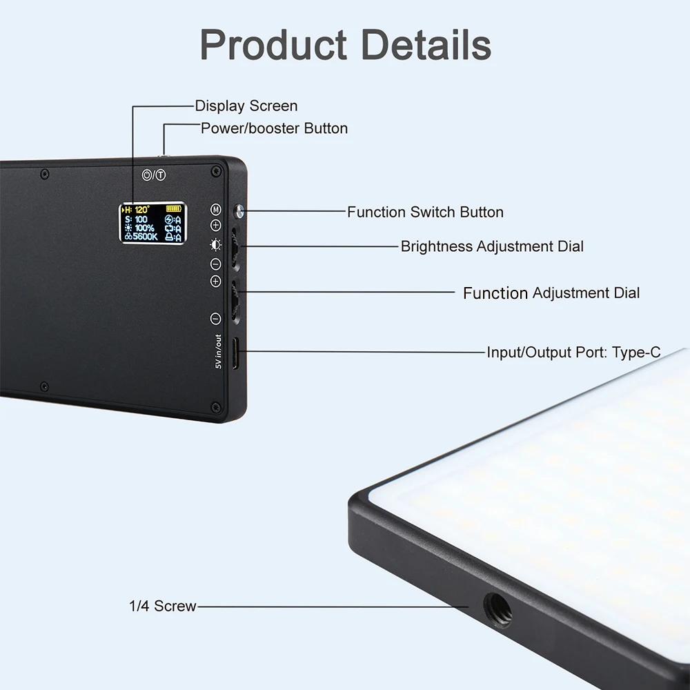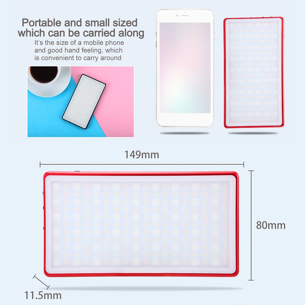 Светильник RGB для видеосъемки, 198 ламп, регулировка яркости 1%-100%, цветовая температура 3200-5600K, RA>96 +. 0-360 ° полноцветный, регулировка насыщения 1-100 цветов. Поддержка 9 всеобщее используемое светильник эффект режимы съемки моделирования и 100s ультра яркие красные/зеленые/функции режима.