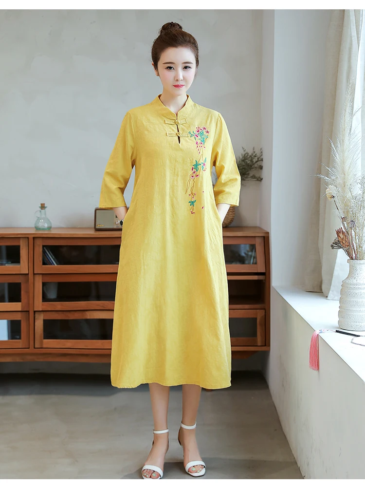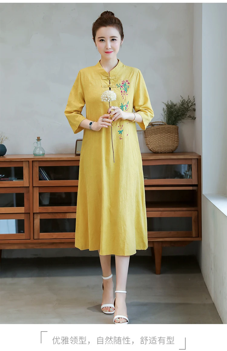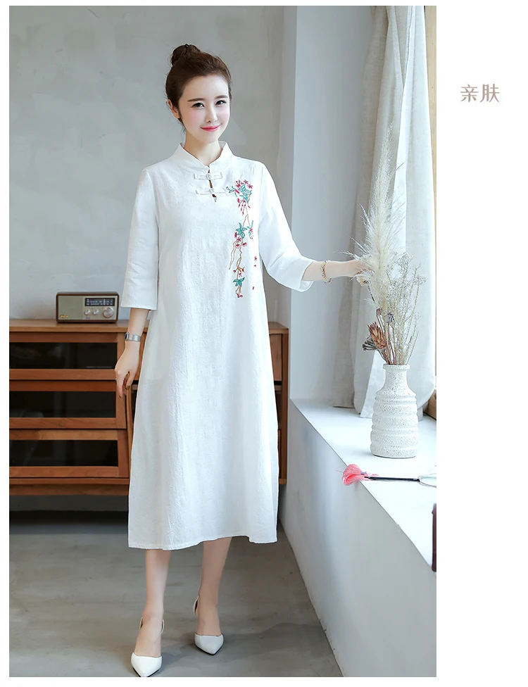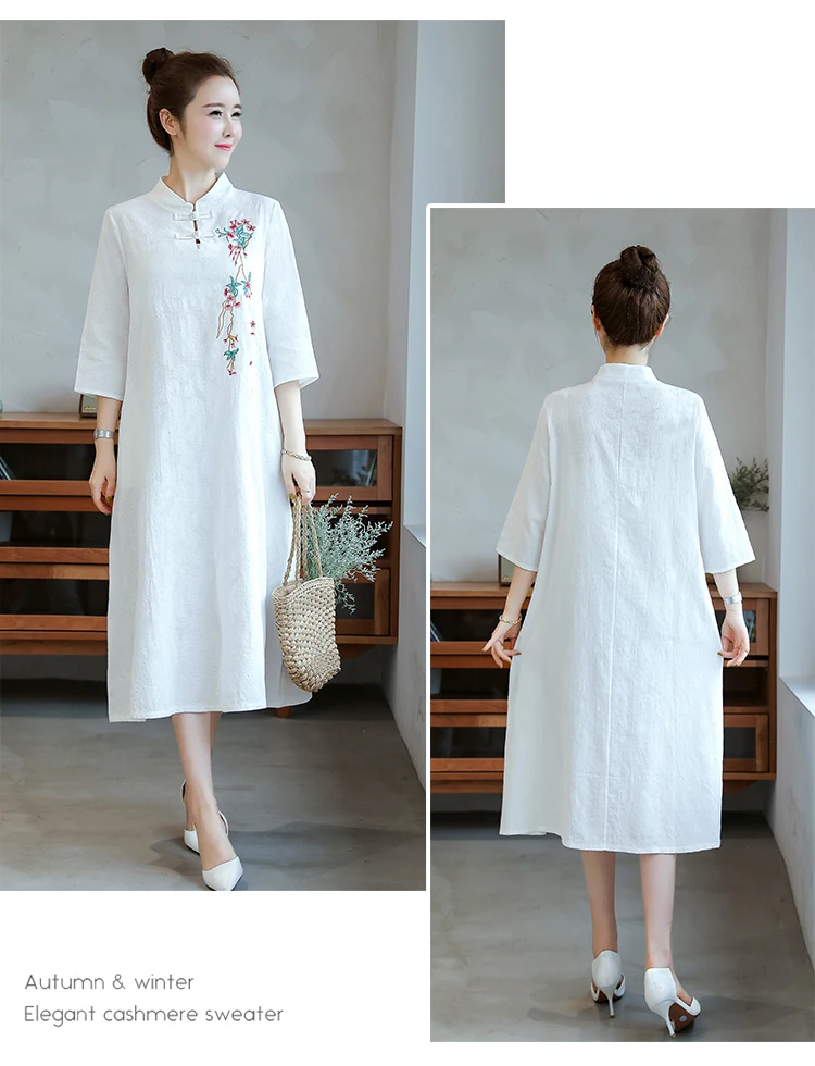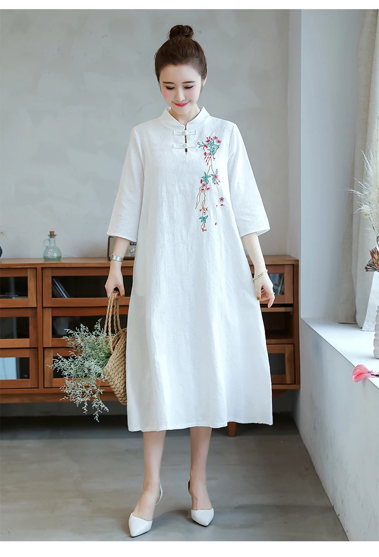 Женское винтажное платье-миди из хлопка и льна, с цветочной вышивкой