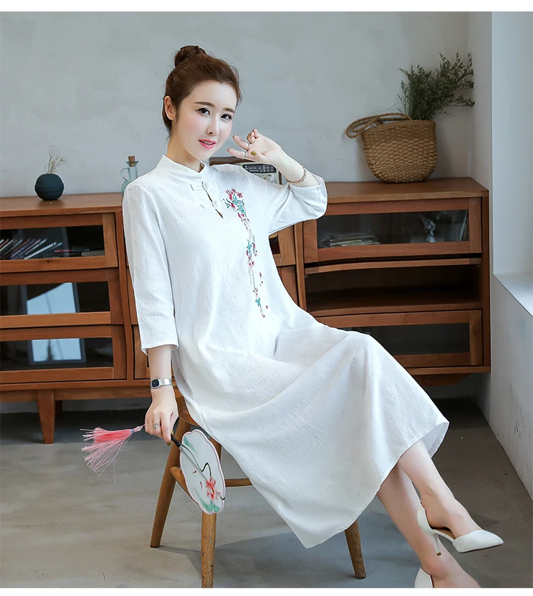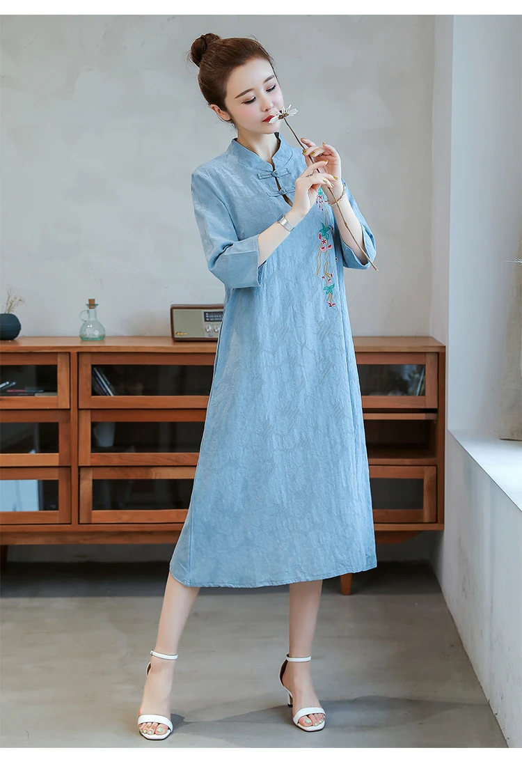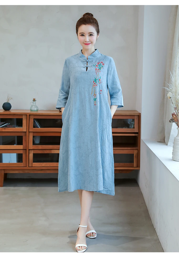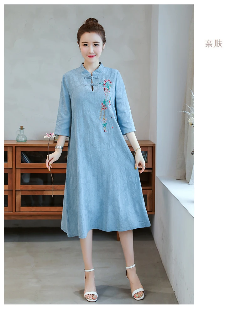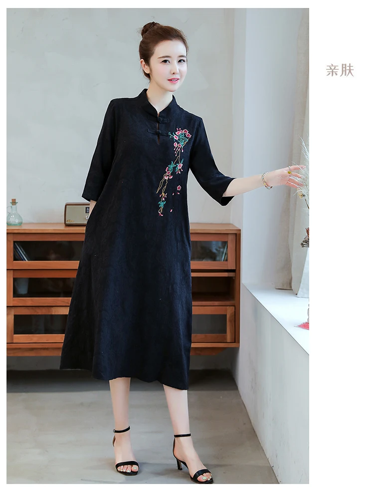 Женское винтажное платье-миди из хлопка и льна, с цветочной вышивкой
