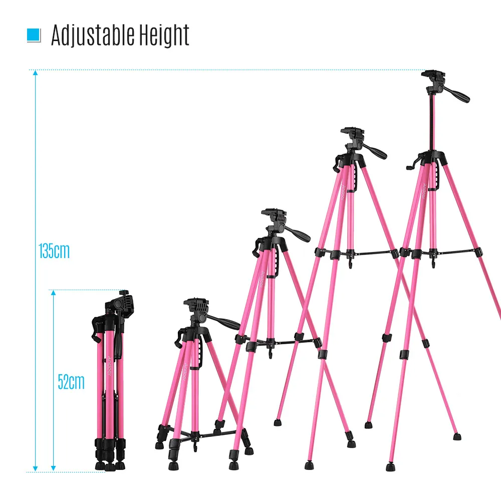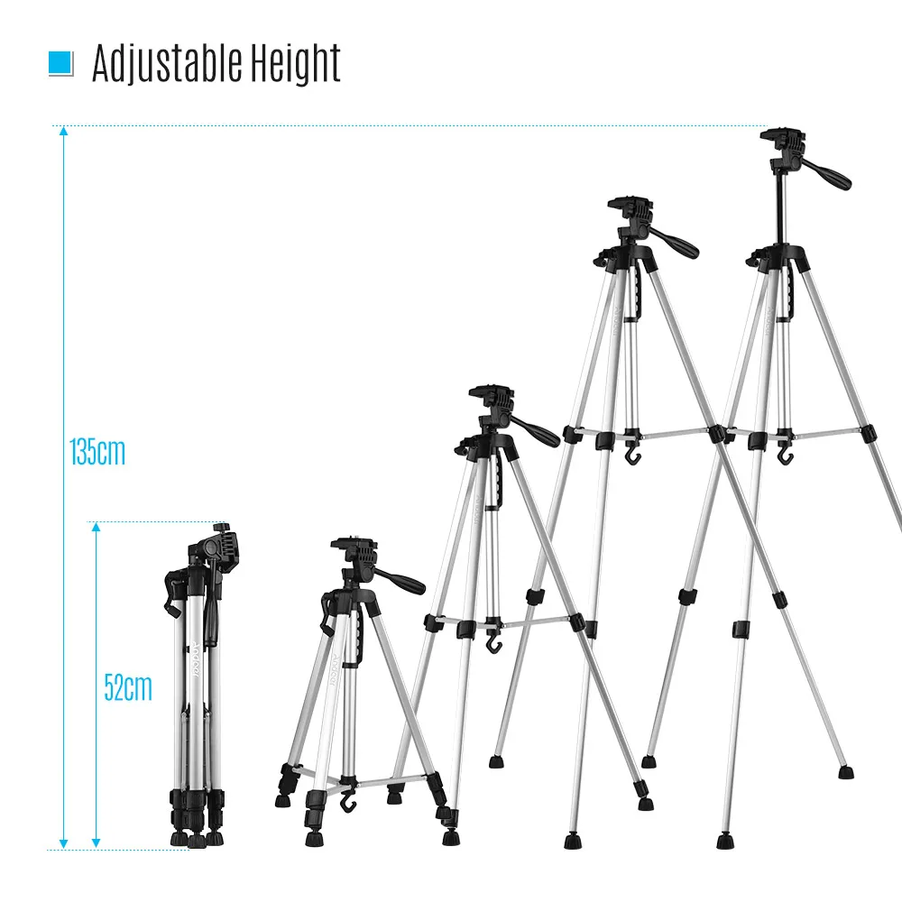 Регулируемая высота:3-секционный Телескопический ноги и средней оси дизайн, чтобы вы могли регулировать штатив высотой свободно, а максимальная высота использования составляет до 135 см в тех случаях, когда средней оси является полностью выдвинуты.