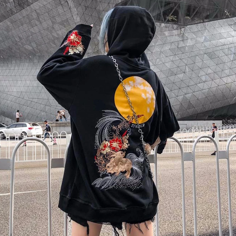 Толстовки с капюшоном с вышитыми животными цветами и кроликами Harajuku, Модный пуловер, толстовки в стиле хип-хоп, Повседневная Уличная одежда
