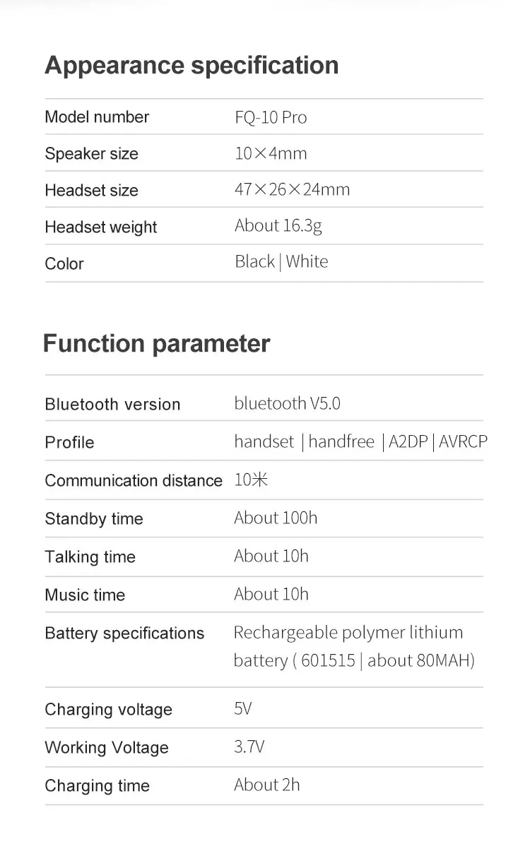 D. Спецификация bluetooth-гарнитуры: Беспроводной диапазон: 10 м/33 фута/Время зарядки: 1,5 часов/Время ожидания: 100 часов/Bluetooth шнур для Наушников длина: 34 см/13,4 дюйма