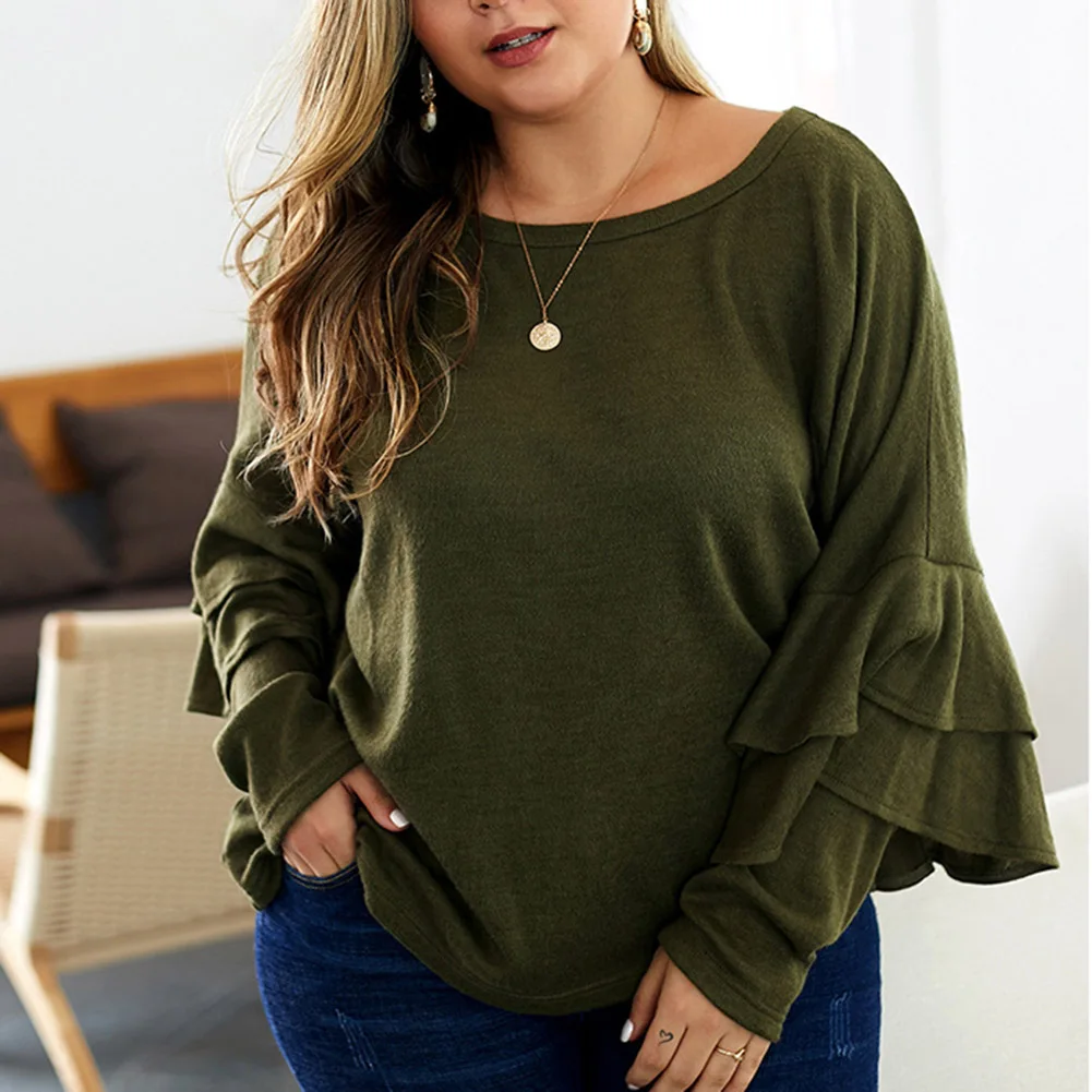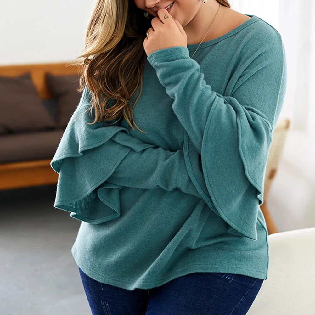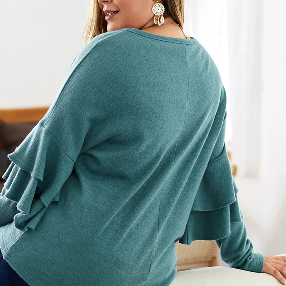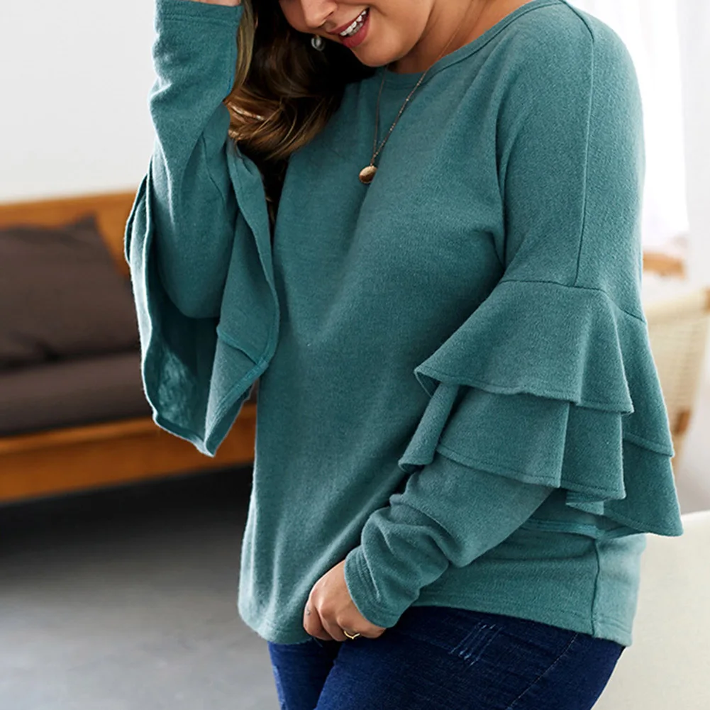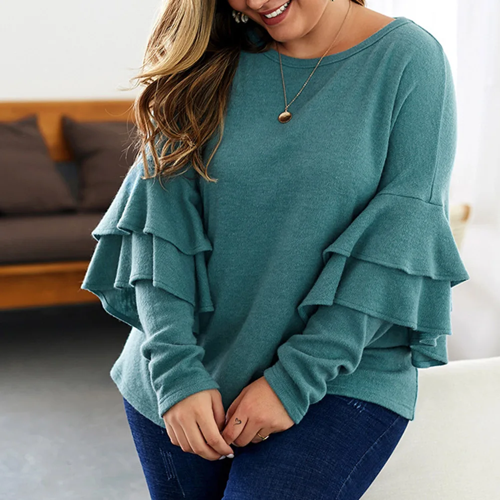 Fadzeco Женская модная футболка большого размера Осень Зима однотонный длинный рукав с рюшами Свитшот Повседневный Свободный пуловер Топы