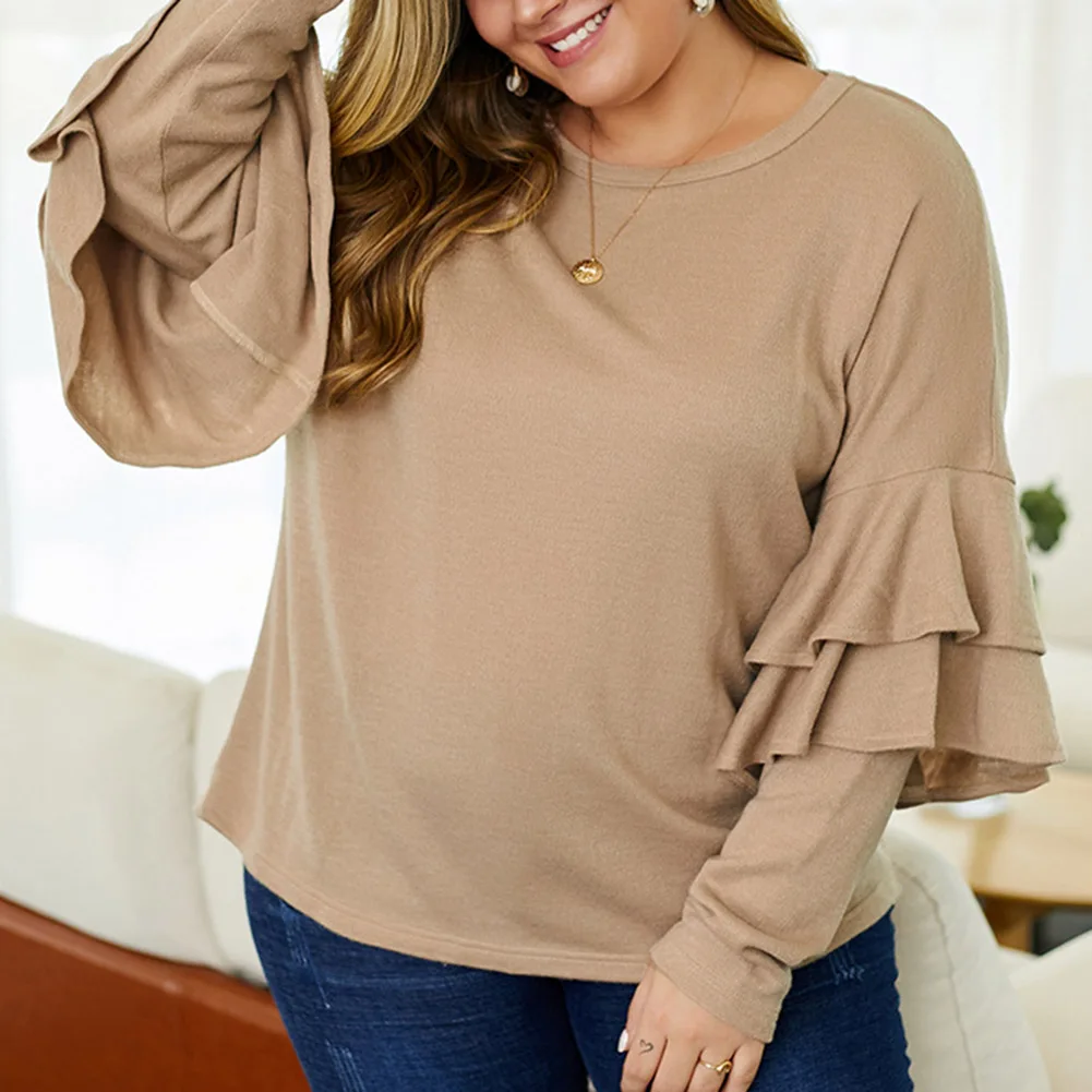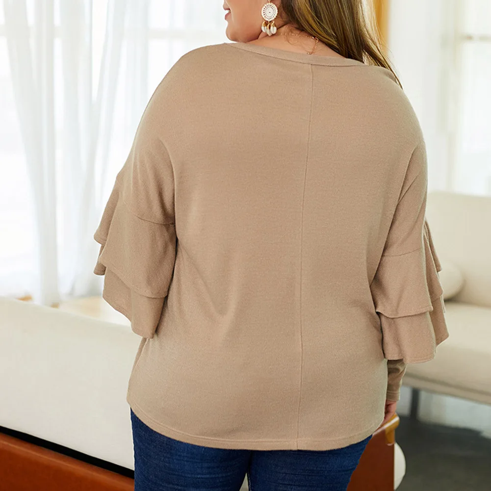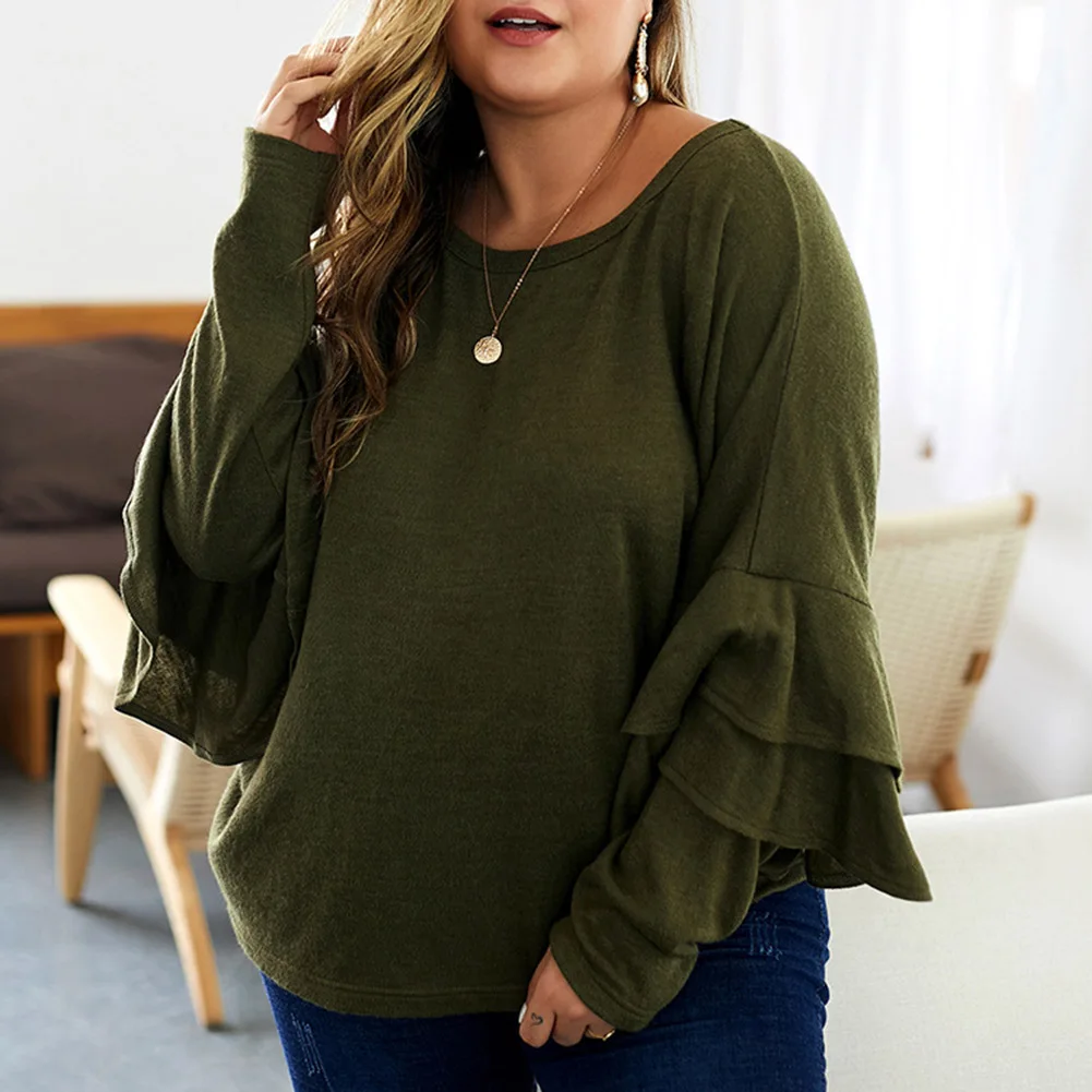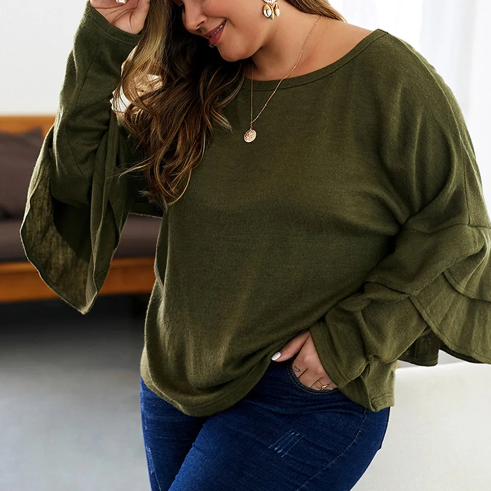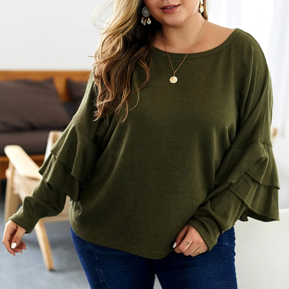 Fadzeco Женская модная футболка большого размера Осень Зима однотонный длинный рукав с рюшами Свитшот Повседневный Свободный пуловер Топы