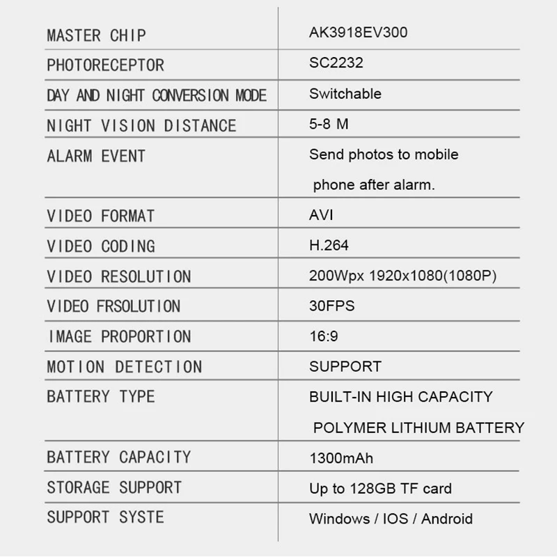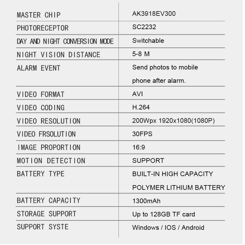 Lens: 3.6mm @F2.56 diagonal field angle 120 degrees