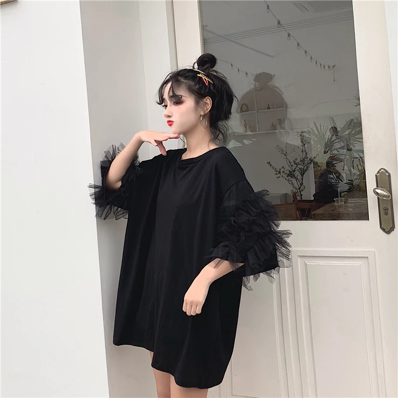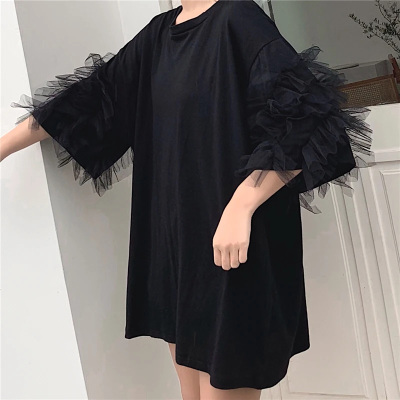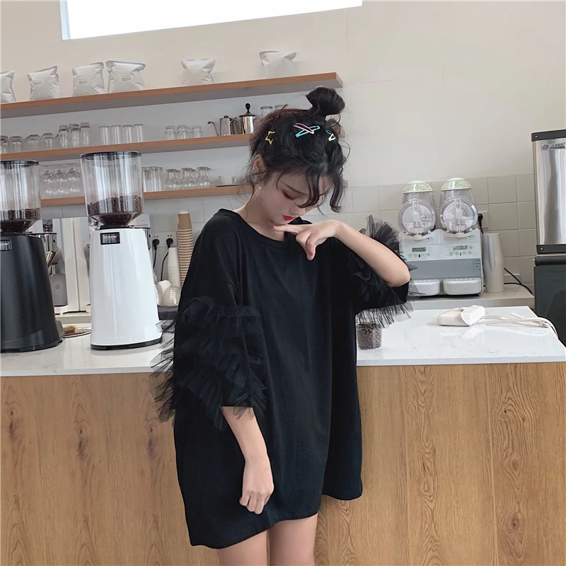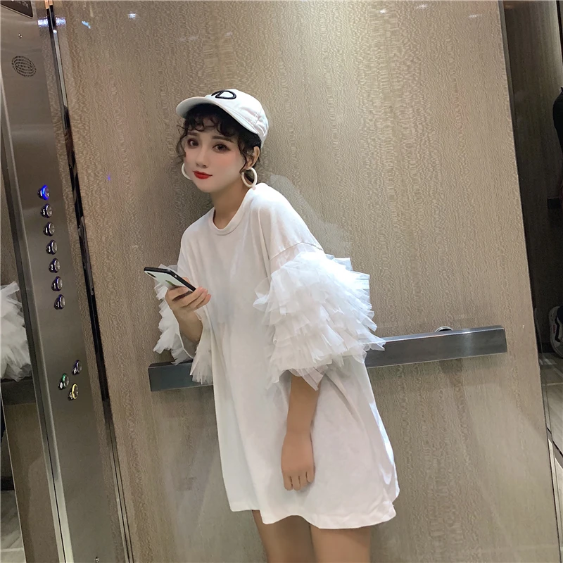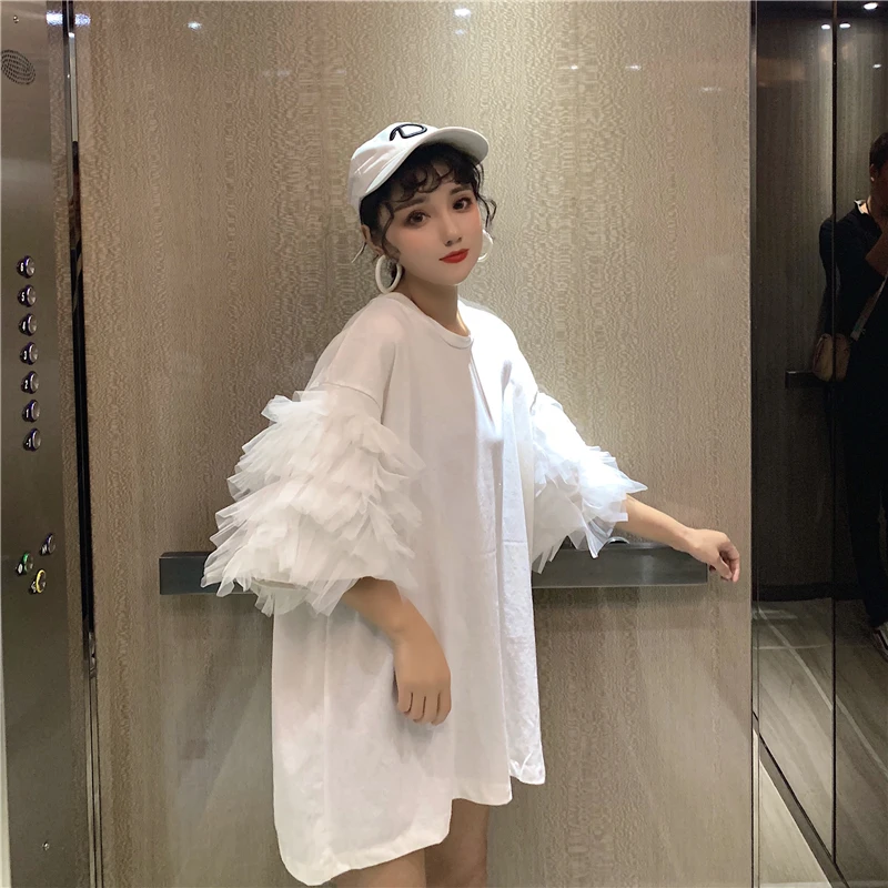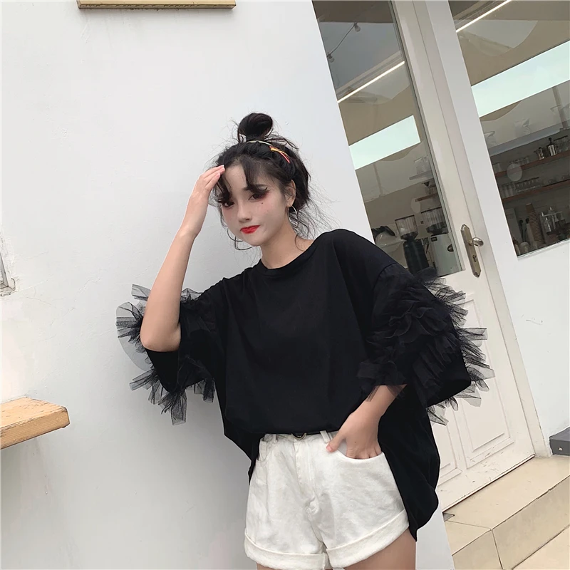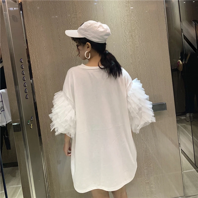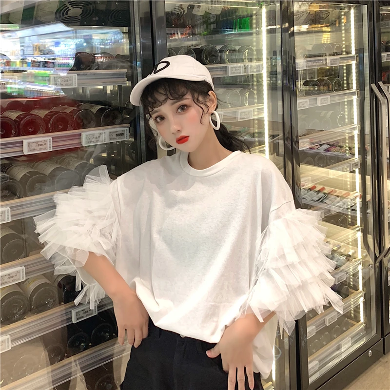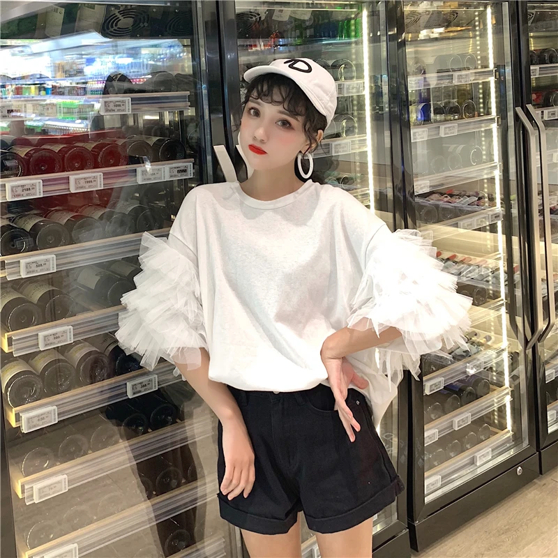 Свободная летняя футболка оверсайз с коротким рукавом, сетчатый хлопковый топ, белые женские футболки, женская футболка с пышными рукавами AQ831