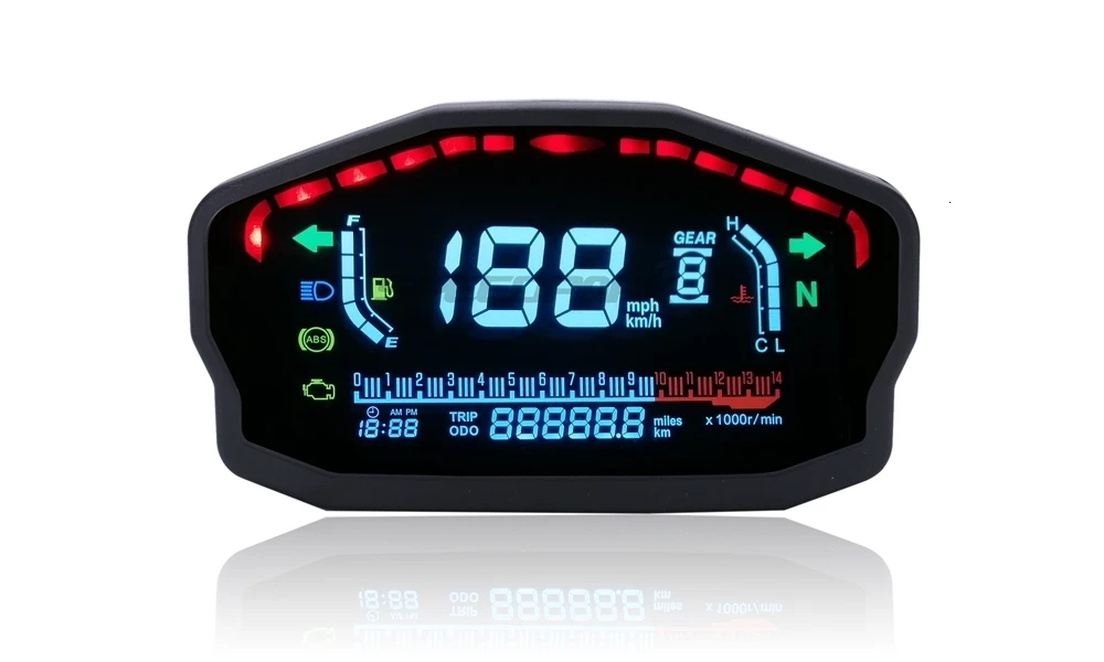 100% Новинка и высокое качество Неисправности двигателя свет напоминания Отображение времени Общее пройденное расстояние Водонепроницаемый, солнцезащитный, прочный Простая установка и простое управление Технические характеристики: Напряжение питания: 8-12 В постоянного тока Цвет корпуса: черный Дисплей скорости: км/ч, mph Диапазон отображения скорости: 0-199 км/ч (миля) Внутренний дисплей: <0,5 секунд Дисплей одометра: 0 ~ 999999 км (миля) Дисплей одометра: 0,1 км Дальность отображения счетчика: 999,9 км (миля) Дисплей счетчика поездки: 0,1 км Диапазон оборотов: 0 ~ 14000 об/минВремя: 12 часов