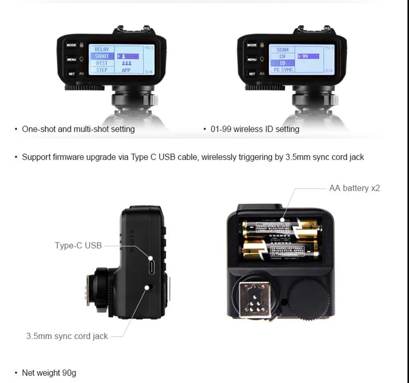 Godox X2T-C/N/S/O/F TTL Беспроводной вспышка триггера для Canon,Nikon,Sony, соединение Bluetooth поддерживает iOS/Android App Contoller, 1/8000s HSS, TCM Функция, 5 отдельных кнопок, переделанное управляющее колесо, Новая Блокировка обуви, новый вспомогательный светильник AF Беспроводной триггер Godox X2 серии TTL может работать со вспышками камер Godox, вспышками на улице и студийными вспышками со встроенной беспроводной радиосистемой Godox X. X2 обеспечивает стабильный, надежный и эффективный сигнал передачи в режиме реального времени, что делает его хорошим выбором для фотографов, у которых есть различные требования к освещению. Новые обновленные функции: 1. Удобный дизайн, простота в эксплуатации ЖК-дисплей с четкий дисплей эффект; С 5 Группа кнопок регулировки, и 3 функциональных кнопок для того чтобы осуществить Быстрые настройки 2. Поддержка Bluetooth Используйте сотовый телефон на базе iPhone/Android или Планшеты на базе iPad/Android для подключения X2 через Bluetooth после загрузки приложения GodoxPhoto вы можете управлять режимом flash, выходная мощность, режим освещения моделирования, звуковой сигнал Godox мигает и т. Д. 3. Быстрая блокировка обуви 4. Минимальная выходная мощность может быть точно настроена на 1/256 в 1/10 шаг регулировки Все группы и функциональные кнопки имеют задний светильник ing, легко управляется даже в условиях, когда низкий светильник Функции: Поддержка TTL autoflash и профессиональных функций Совместимость: X2T-C для камер Canon; X2T-N для фотокамеры Nikon; X2T-S для камер Sony; X2T-F для фотоаппаратов Fujifilm; X2T-O для цифровой камеры Olympus и Panasonic цифровых зеркальных фотоаппаратов и X2T-P для камер Pentax. С 5 групп, 32 канала и доступ к 99 настройкам беспроводного ID, чтобы уменьшить интерференцию из других прилегающих систем. (Напоминание: только когда беспроводной идентификатор и канал основной флэш-памяти будут одинаковыми, они могут быть отключены.) Полная поддержка TTL автовспышка, 1/8000s высокоскоростную синхронизацию, multiflash режим, режим ручного управления, флэш-compensatin, регулировка освещения параметр через мобильное приложение, сканирование настройки, установка с одним и несколькими выстрелами, управление лампами моделирования, регулировка выходной мощности всех групп одновременно и т. Д. Новая функция настройки сканирования может помочь с автоматическим обнаружением канала с помощью меньше помех. Поддержка обновление прошивки через Тип C USB кабель, в беспроводном режиме всплывающие предупреждения по 3,5 мм кабель синхронизации 。 Что входит в комплект 1 x Godox X2T-C / N/ S /O /F триггер Руководство пользователя-1 шт.; Цветные фильтры (бесплатный подарок)-1 шт. 1 x ручка для объектива (бесплатный подарок) 1 х чехол для аккумулятора аа (бесплатный подарок)
