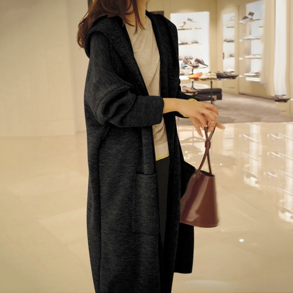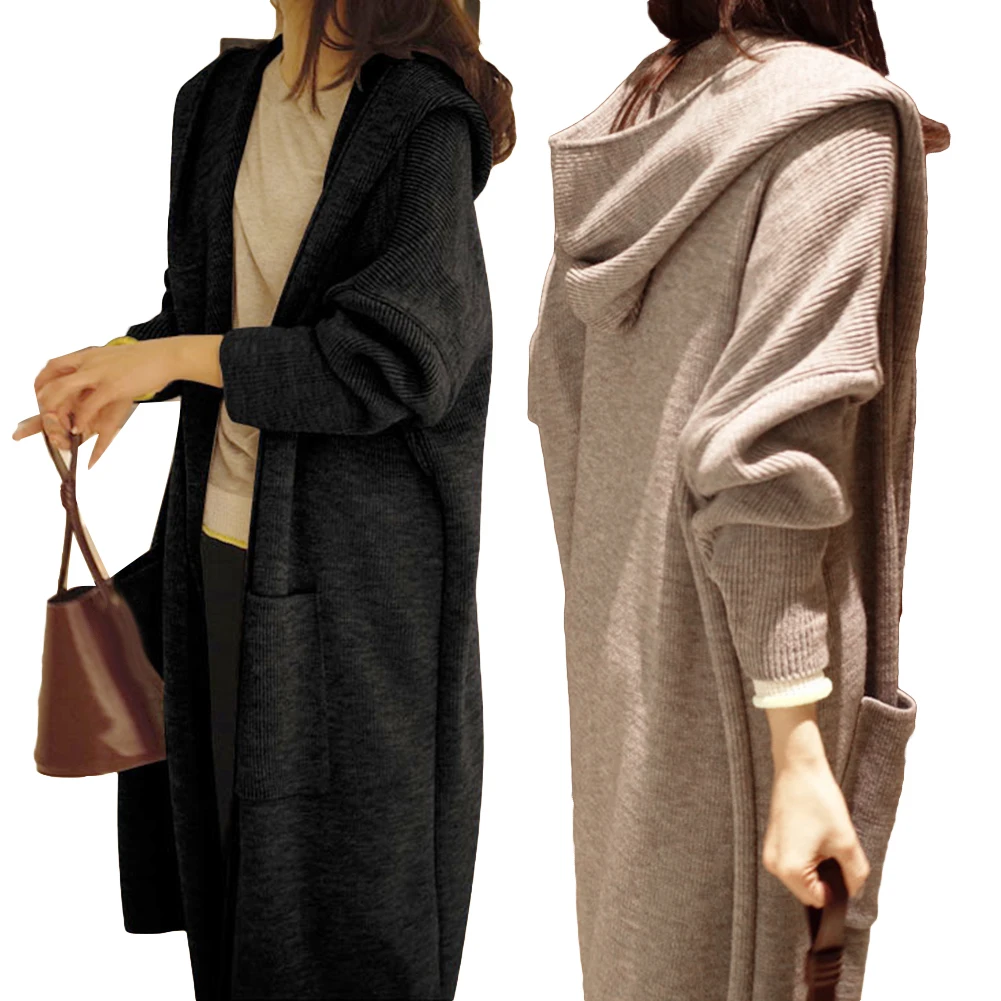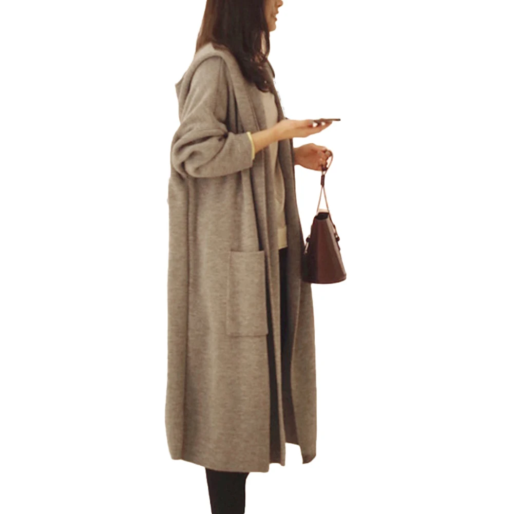 Повседневный Женский Осенний однотонный шерстяной вязаный кардиган с капюшоном, свободное тонкое длинное пальто