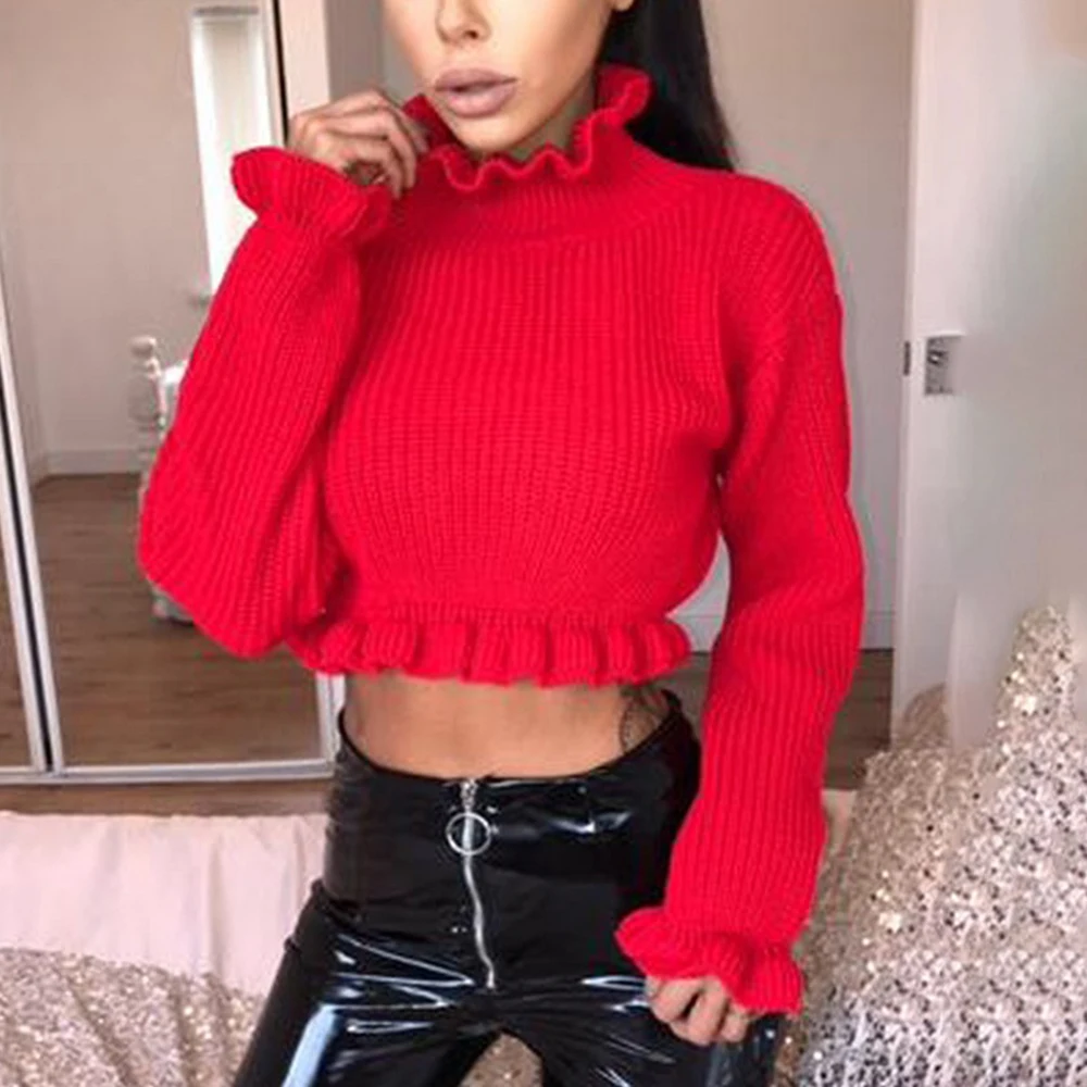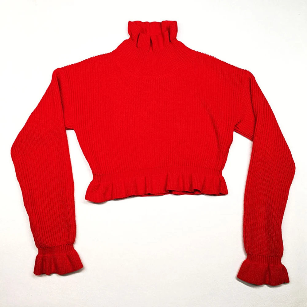Оборки женские свитера с высоким воротником осень зима 2020 Вязанная одежда с длинным рукавом модный сексуальный укороченный женский свитер пуловер