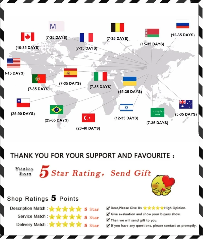 3. О времени доставки, если вы выбираете Почта Китая, чтобы отправить посылку, она обычно тратит около 12-60 дней на транспортировку, но это зависит от страны, в которой вы находитесь. В течение этого времени, если у вас есть какие-либо проблемы, пожалуйста, свяжитесь с нами, чтобы проверить. Поскольку таможенная проблема, это нормально, что иногда требуется больше времени, чтобы отправить, надеюсь, вы можете быть терпеливыми, чтобы ждать, мы постараемся сделать все возможное, чтобы помочь вам.