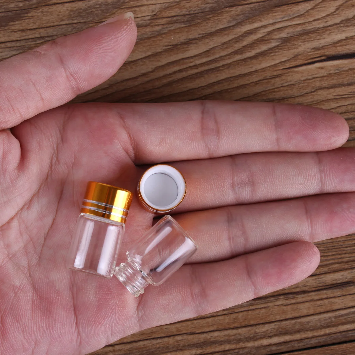 Оптовая продажа 100 штук 2 мл 16*26 мм стеклянные бутылки с золотистыми колпачки Мини