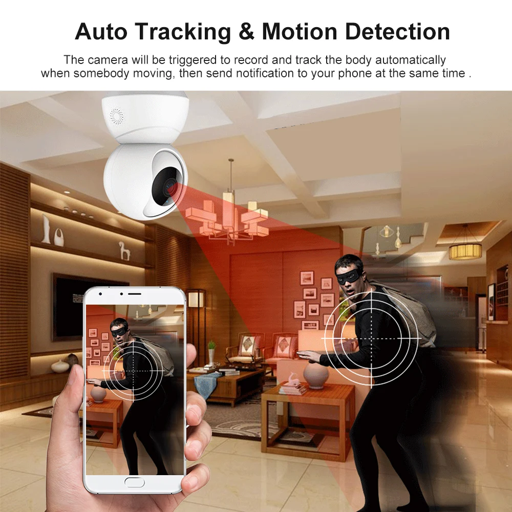 【Автоматическое отслеживание и обнаружение движения 】Камера будет срабатывать, чтобы записывать и отслеживать тело автоматически, когда кто-то движется, а затем отправлять уведомления на ваш телефон в то же время.