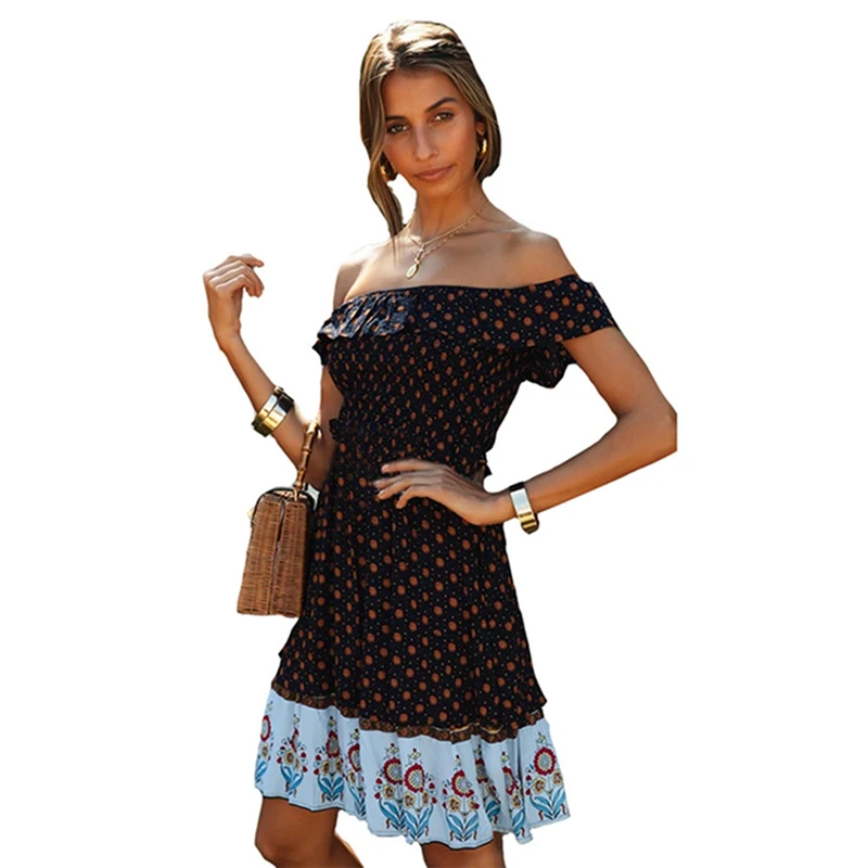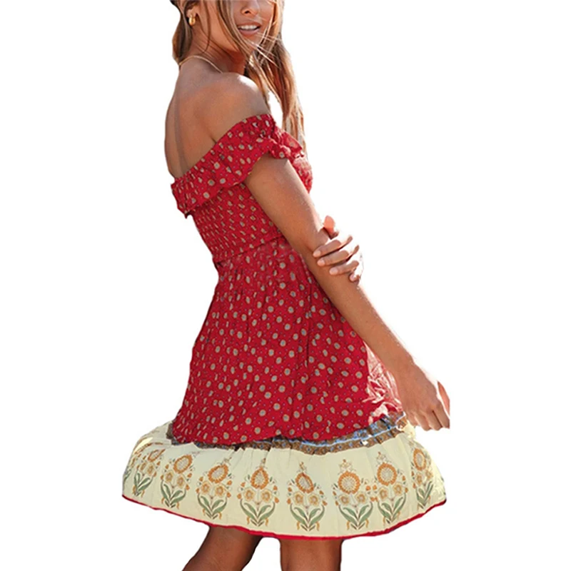 2020 модное летнее женское сексуальное платье с открытыми плечами в стиле бохо, Повседневное платье без рукавов в горошек, вечерние платья для пляжа, Короткое мини-платье