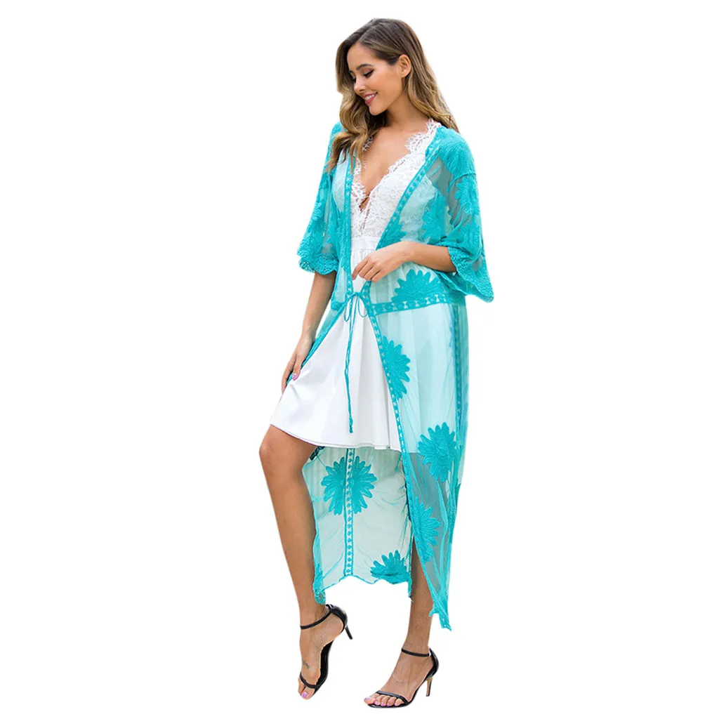 3. 3/4 sleeve, long length, embroidered, sheer mesh, see-through, charming and attractive. Simple but fashion. Loose fit. Prevent skin damage when you play on the beach.