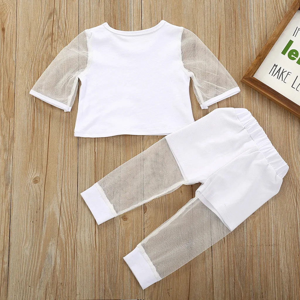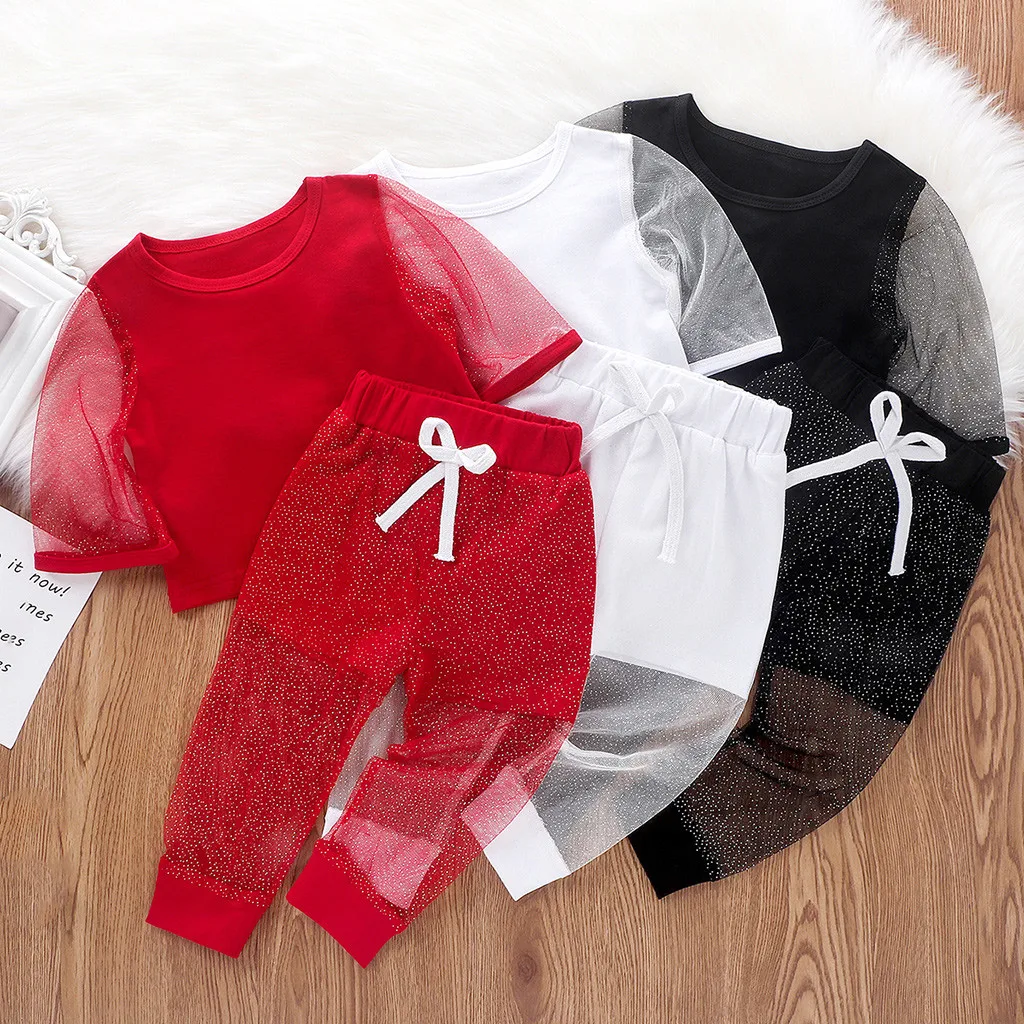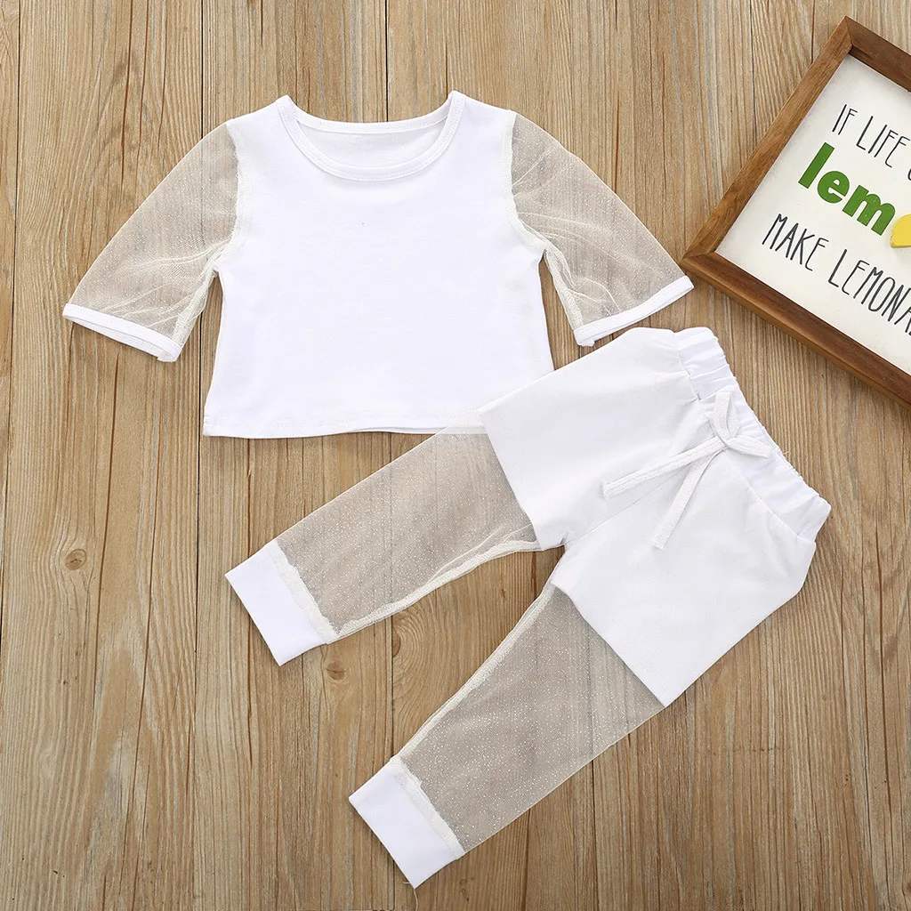 Комплект одежды из 2 предметов для маленьких девочек: однотонный топ с длинными рукавами и фатиновой юбкой + штаны в горошек