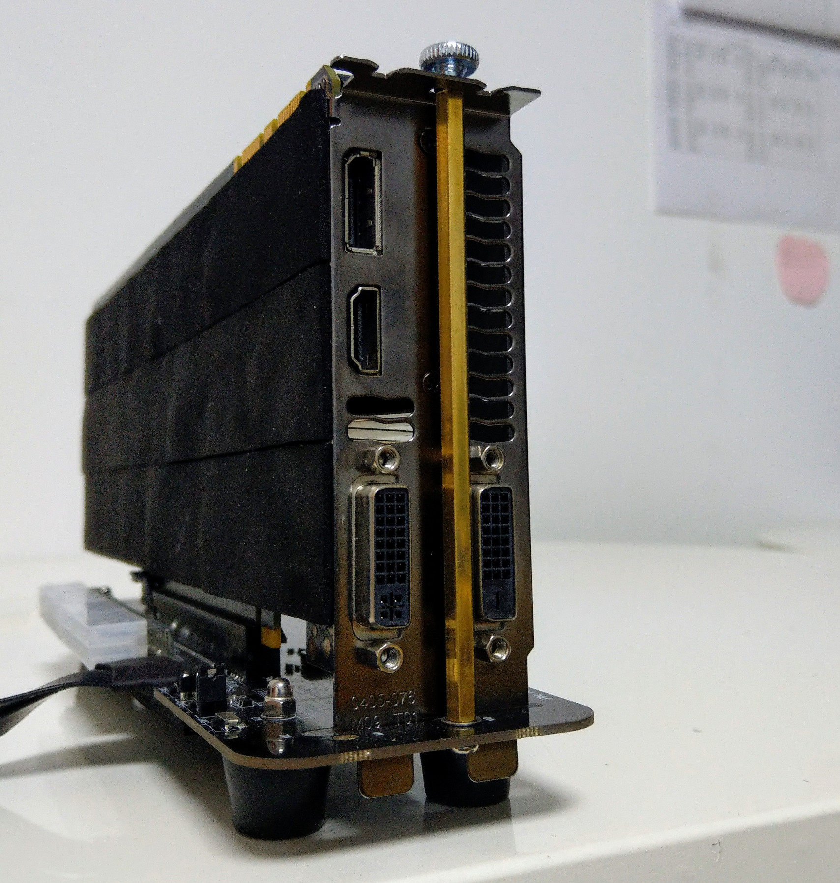 1. Установите шестиугольную медную колонку и вставьте видеокарту в разъем PCIe x16. Затяните винты так, чтобы видеокарта не встряхивала и не выпадала