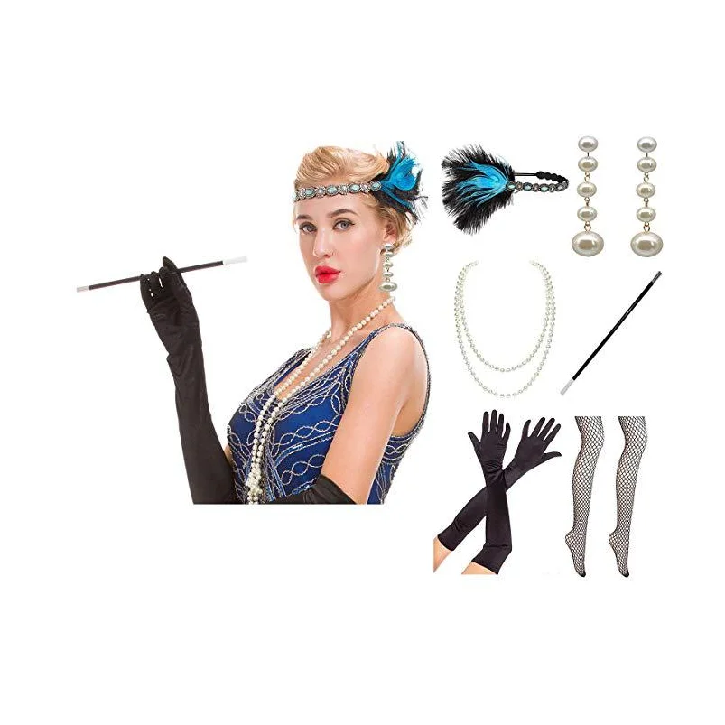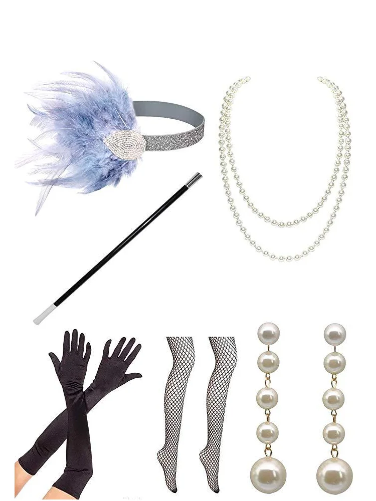 Посылка включает в себя: повязка на голову 1920s, серьги, жемчужное ожерелье, перчатки, сетчатые колготки