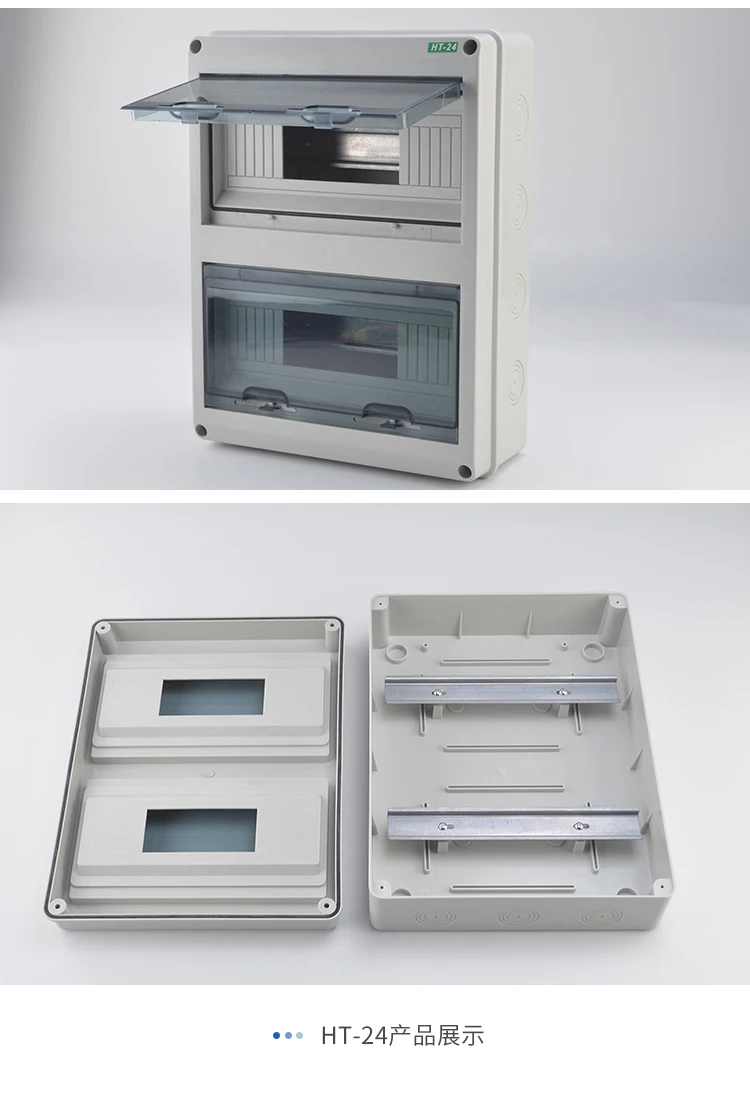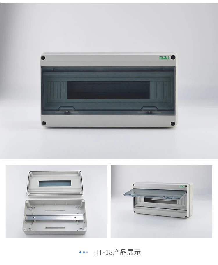Распределительная коробка серии HT изготовлена из высококачественного АБС-пластика (корпус) + поликарбоната (прозрачная крышка), обладает водонепроницаемостью и пыленепроницаемостью, устойчивостью к коррозии и длительным сроком службы. Хорошая герметизация, класс водонепроницаемости достигает IP65. На каждой стороне коробки есть готовые отверстия для подключения. Интерьер оснащен 35 мм din-рейками, которые могут использоваться с мини-выключатели цепи (MCB). Он широко используется для бытовых, осветительных систем, наружных временных распределительных помещений, а также для электрического и электронного контроля оборудования в суровых условиях, крупных заводов, нефтехимических предприятий, кораблей, доков и т. д.