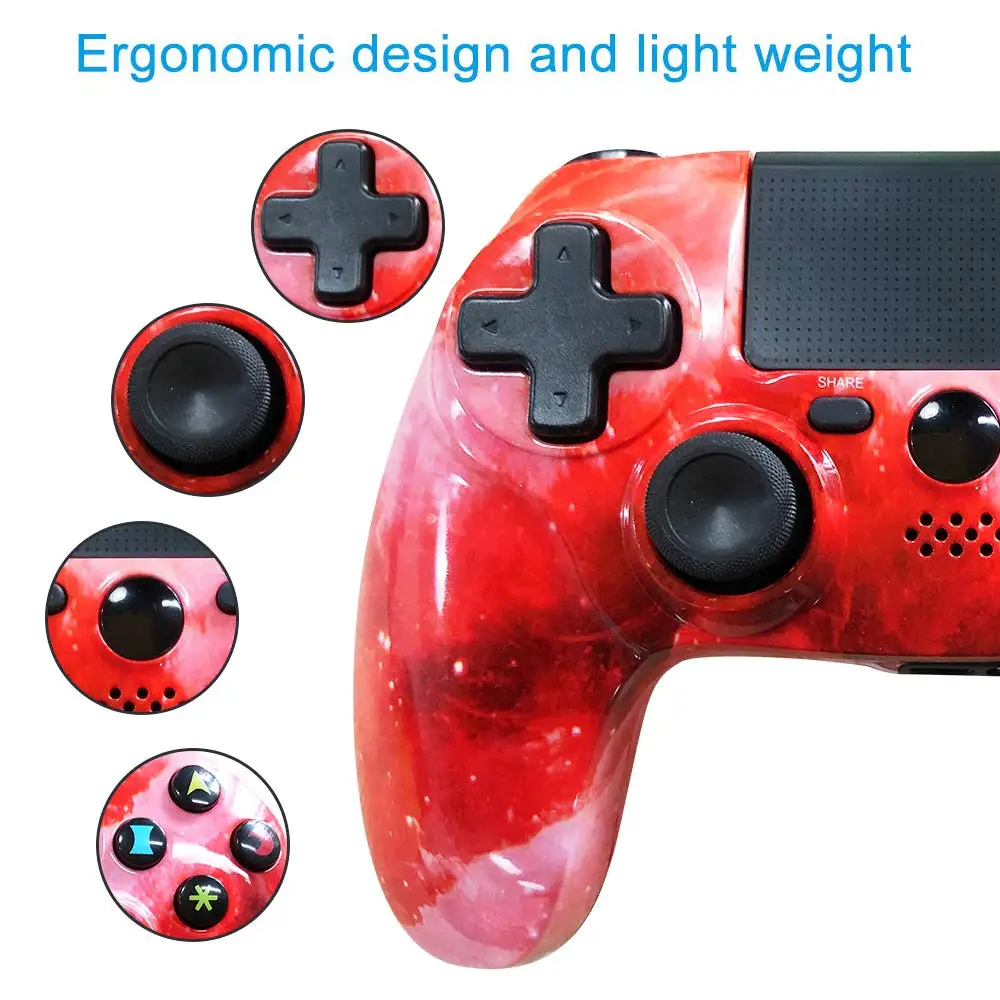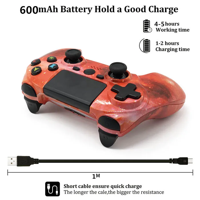 Входная мощность: 5V-600mA Тип батареи: встроенный литий-ионный аккумулятор Напряжение: 3,65 V Батарея Ёмкость: 1Ah Рабочая температура: 5 ℃-35 ℃ Масса: Approx.210g Внешняя защита: Следуйте приведенной ниже инструкции, чтобы предотвратить ухудшение внешнего вида продукта или обесцвечивание. Используйте мягкую сухую ткань для очистки продукта. Не используйте растворители или другие химические вещества. Не протирайте химической чистящей тканью. Регистрации контроллера: В первый раз, когда вы используете контроллер, или когда вы хотите использовать контроллер в другой системе Playstation4, вы должны выполнить регистрация устройства Включите систему PS4 и подключите контроллер к системе с помощью usb-кабеля для завершения регистрации устройства. Материалов покажется шаги: Загрузите батарею к контроллеру. После успешного сопряжения. Одновременно нажмите кнопку «Домой» и «поделиться» с контроллером. Затем вы можете использовать контроллер для игры. О беспроводном контроллере для PS4: Прежде чем использовать этот продукт, внимательно прочитайте это руководство и любые руководства для совместимого оборудования, Сохраните инструкции для справки в будущем. Срок службы и Продолжительность батареи: Не обрабатывайте поврежденные или протекающие литий-ионные батареи. Батарея имеет ограниченный срок службы. Продолжительность батареи постепенно уменьшится при повторном использовании и возрасте. Срок службы батареи также зависит от способа хранения, условий использования и экологических факторов. Зарядка в среде, где диапазон температур составляет от 10 ℃ до 30 ℃. Зарядка может быть не такой эффективной при выполнении в других средах. Когда беспроводной контроллер не используется в течение длительного периода времени, рекомендуется полностью изменить его в аренду один раз в год, чтобы помочь поддерживать функциональность аккумулятора. Меры предосторожности при использовании и обращении: Избегайте длительного использования этого продукта. Сделайте перерыв примерно через 30 минут. Прекратите использовать этот аппарат немедленно, если вы начинаете чувствовать себя уставшим или если вы испытываете дискомфорт или боль в руках или нарукавниках во время использования. Если состояние сохраняется, обратитесь к врачу. Этот продукт предназначен только для использования руками. Вибрационная функция этого продукта может привести к травмам. Не используйте функцию вибрации, если у вас есть повреждения костей, суставов или мышц рук или рук. Не подвергайте изделие воздействию высоких температур, высокой влажности или прямых солнечных лучей. Не кладите тяжелые предметы на изделие. Не бросайте и не бросайте товар или не подвергайте его сильному физическому воздействию. Информация об упаковке: 1 * беспроводной геймпад игровой контроллер PS4 1 * Руководство пользователя