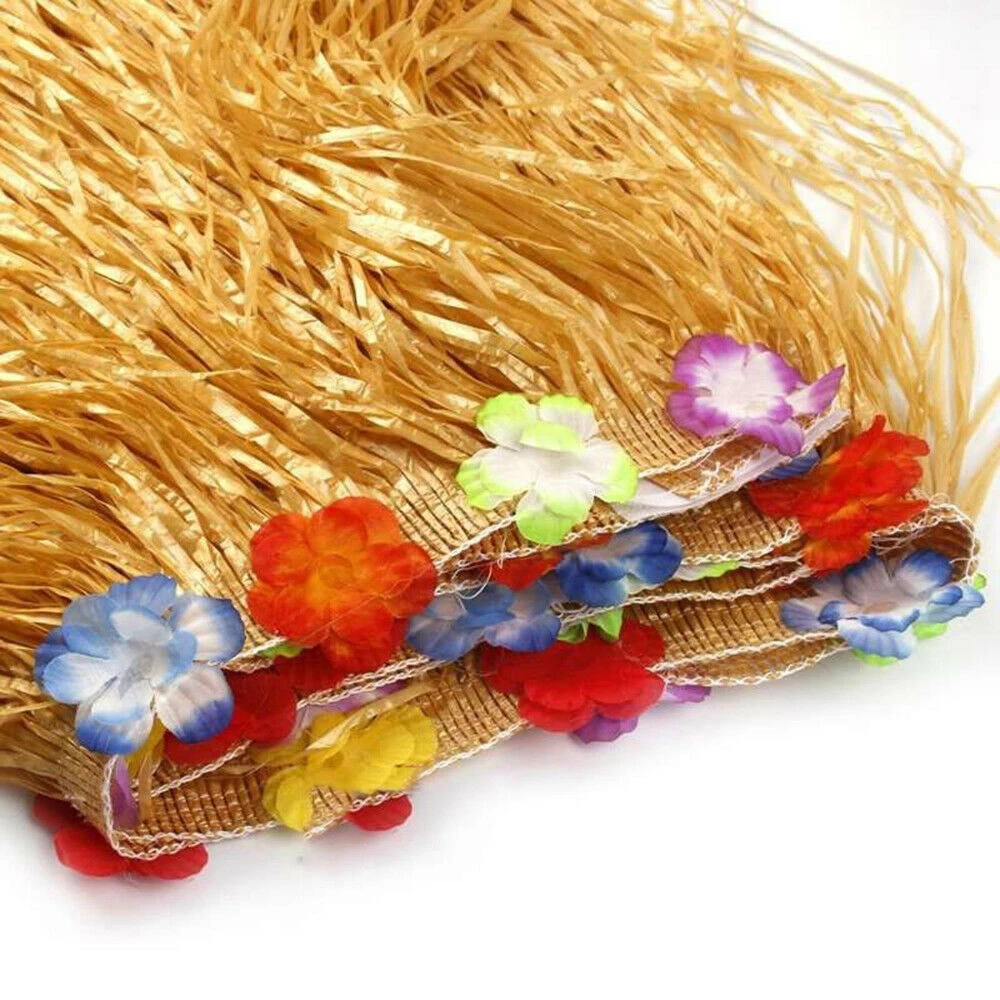 Эта юбка для стола из искусственной травы натурального цвета отделана разноцветными цветами из полиэстера и гибискуса