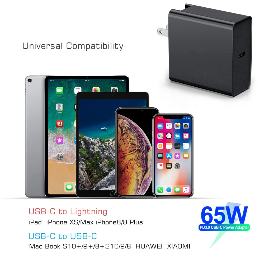 USB Type C настенное зарядное устройство, с доставкой питания, PowerPort Speed PD3.0 QC3.0 для MacBook Pro/Air iPad Pro 2018 iPhone XS/Max/XR/X/8/7/Plus, s10/S9, LG, Nexus, Pixel C/3/2/XL, MateBook и многое другое Для компактного зарядного устройства Type-C для USB-C ноутбуков/MacBook /iPad/iPhone/Samsung Galaxy, Pixel и более PD зарядное устройство для нового MacBook Pro/Air iPhone/iPad Pro Поддержка PD протокола быстрой зарядки и другого оборудования PD3.0 сотовый телефон QC TYPE-C USB зарядное устройство для MacBook Pro / DELL XPS 12/13 / Samsung Note 8 S9 Посылка включает в себя: 1x зарядное устройство Примечание: 1. Требуется 5А E-Mark 100 Вт кабель для зарядки 65 Вт. Для выхода 65 Вт, пожалуйста, приобретите 5А E-Mark 100 Вт Кабель отдельно. 2. Samsung Note 10/10 + быстрая зарядка не поддерживается 3.Dell (DELL) metal superpole 5370/5390 65 Вт зарядка, Dell (DELL) metal superpole 5370/5390 65 Вт владельцы не покупают.