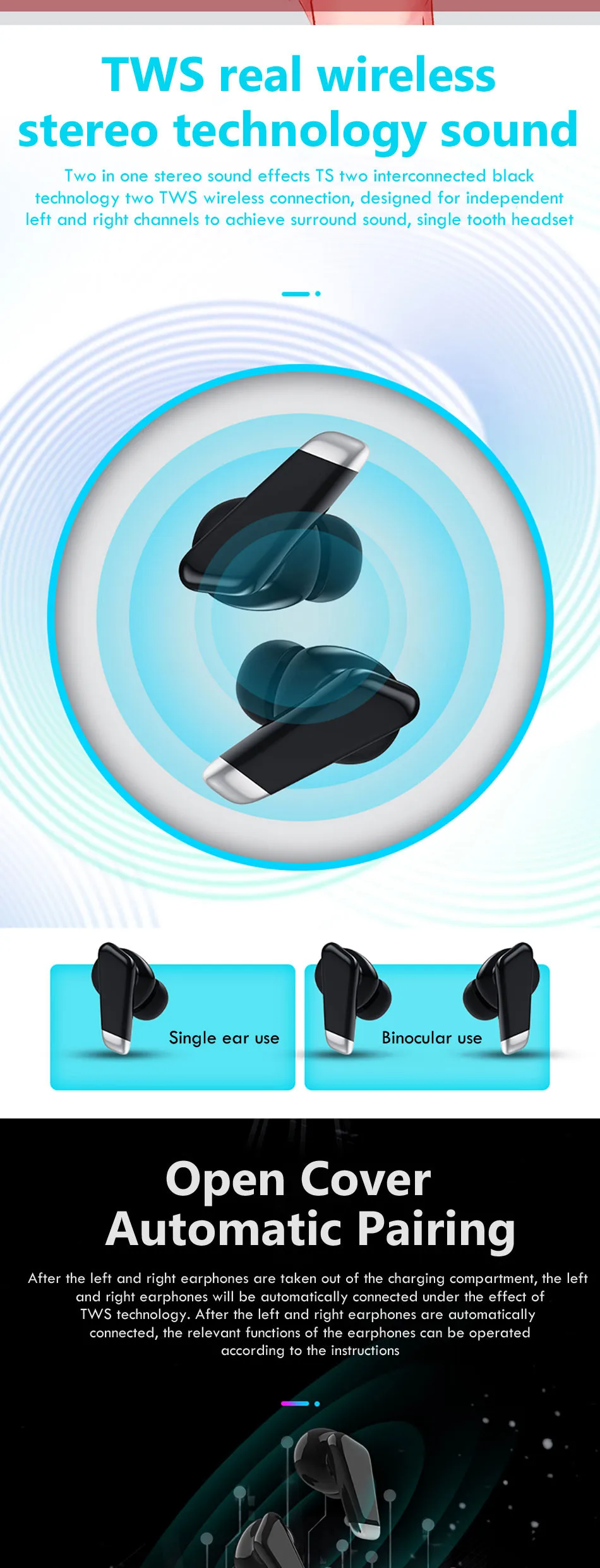Продукт Особенности: 1, Bluetooth V5.0, Поддержка большинства устройств bluetooth и более низкое энергорасход 2. Чехол для зарядки емкостью 500 мА · ч может заряжать 2 наушников примерно 5 раз, что обеспечивает больше времени для прослушивания музыки. 3, с водонепроницаемой технологией IPX5, больше не нужно беспокоиться о воде и поте 4, 8MMS dual drive, наслаждайтесь 9D насыщенными басами, музыка 5, популярная функция сенсорного управления, поддержка переключателей песен, телефонных звонков и голосовых вызовов. Аксессуары для списка: Наушники Bluetooth 2 шт. 1 * зарядный чехол 1 * USB кабель 1 * Руководство пользователя 3 чашки для наушников (S,M,L)