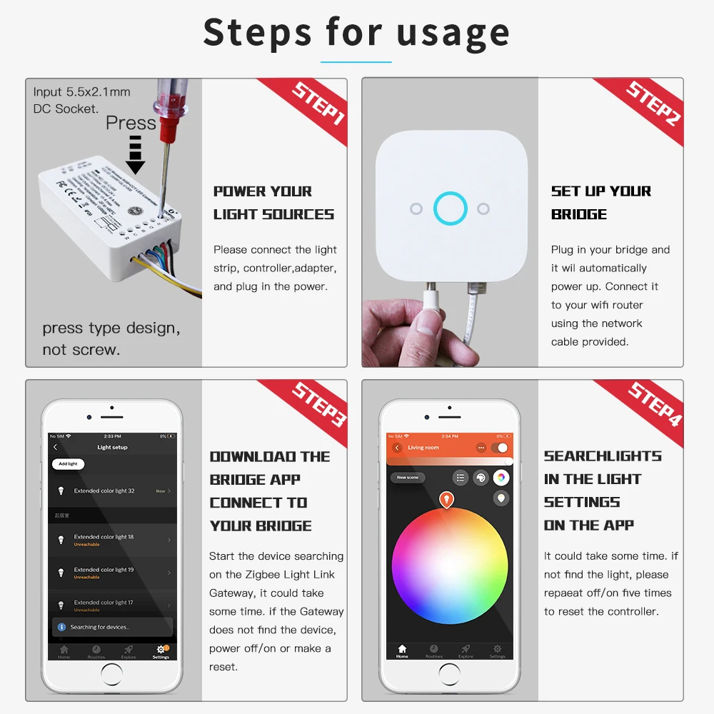 Инструкции:Спасибо за покупку нашей продукции.В этом руководстве мы объясним подключение проводов и подключение к светильник ZigBeeСоединительный шлюз.Эти устройства работают со многими шлюзами ZigBee светильникПроводное Соединение:1. Пожалуйста, подготовьте кабель, такой как картинка P1, и снимите изоляцию на 9-10 мм. КабельПоперечное сечение должно быть между 0,33 и 2,08 мм сечением 2;(AWG22-14).2. Теперь нажмите на клемму с помощью отвертки и вставьте кабель, см. Изображение P2.3. Снимите отвертку и кабель подключен к клемме.На изображении P3-P7 вы можете увидеть примеры подключения различных светодиодный контроллеров:-P3 для RGBW/RGBWW продуктов-P4 для продуктов RGB, используйте RGBW контроллер и не подключайте провод W-P5 для одного цвета светодиодный продукт, используйте RGBW контроллер и не подключайте проводR, G, B-P6 для RGB + CCT (теплый белый + coldwhite) продуктов-P7 для CCT (теплый белый + coldwhite) продуктовПодключение к шлюзу:1. Подключите светодиодный продукт к контроллеру см. Раздел «проводное соединение».2. Начните поиск устройства на шлюзе ZigBee светильник, это может занять некоторое время.Если шлюз не обнаруживает устройство, подключите выключение/включение или сделайте сброс.3. Шлюз нашел ваше устройство, и вы можете присваивать его различным комнатам/зонам/групп.4. Теперь вы можете использовать устройство.Сброс:1. Включите устройство.2. Теперь Выключите и включите в течение 2 секунд.3. Повторите выключение/включение четыре раза.4. Сброс выполняется, когда устройство включено в пятый раз, и светильник остается включенным после мигания 4 раза.
