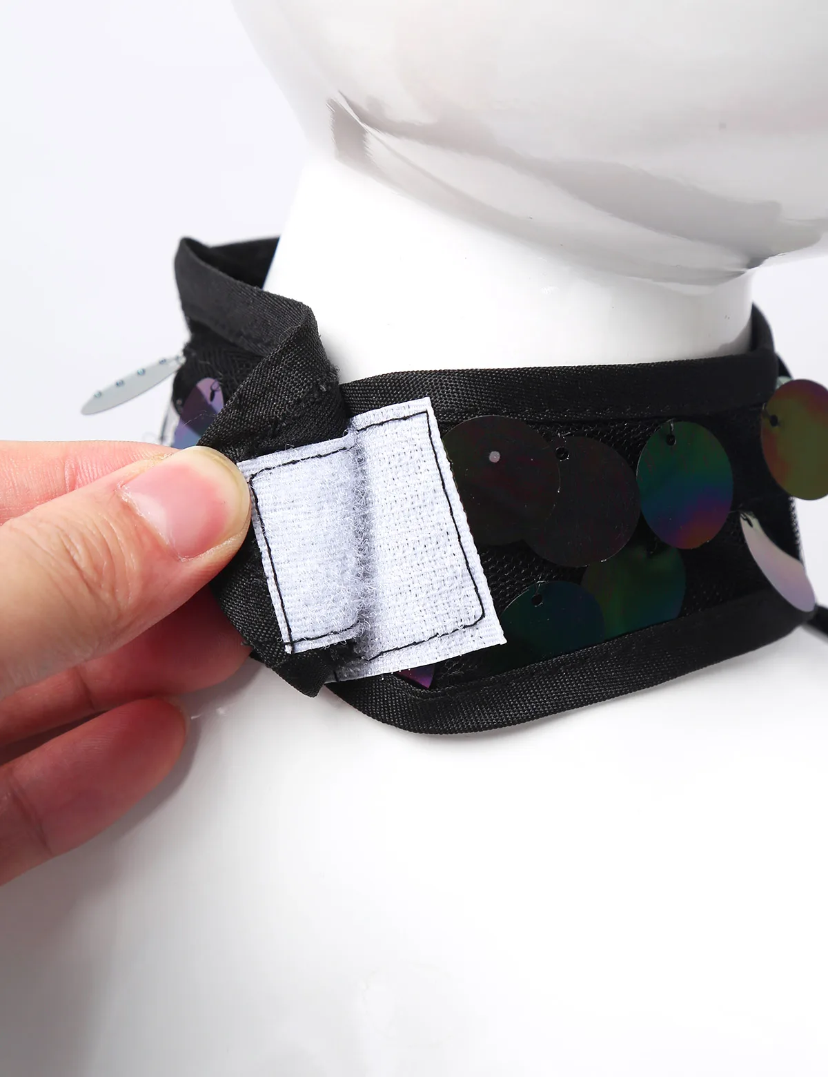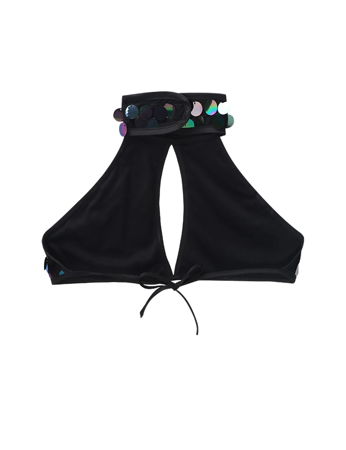 Кроп-топ без рукавов, вырез с крючком и петлей. Украшены блестящими пайетками, Замочная скважина спереди, открытая спина, регулируемые лямки сзади.