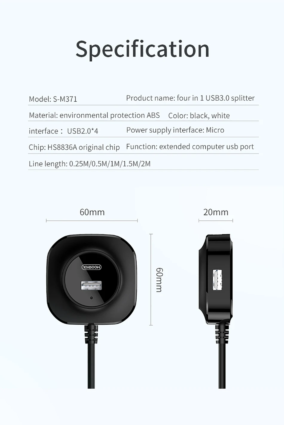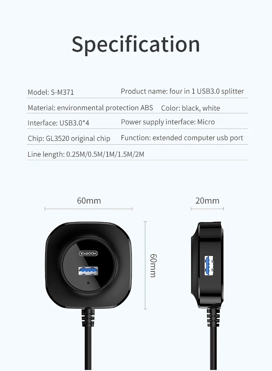 1. High speed USB3.0 transmission, 4 USB ports are extended for the computer, saying goodbye to repeated plugging. 2. Light blue low light indicator light, soft and not dazzling, always know the working state. 3. Compatible with multiple systems, plug and play. 4. Multiple length selection to meet different application scenarios. 5. Equipped with Micro USB interface, external power supply can be connected