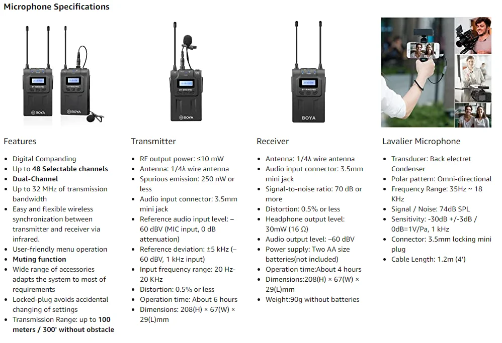 Бренд: BOYA Модель: BY-WHM8 Pro Тип осциллятора: PLL синтезированный управляющий осциллятор группа каналов: A или B Номер канала: 48 Диапазон несущей частоты: 556,71 МГц-575,98 МГц (передатчик A); 576,39 МГц-595,66 МГц (передатчик B) Выходная мощность RF: <= 10 мВт соотношение сигнал/шум: 80 дБ Spurious излучение: 250 Вт или менее эталонное отклонение: ± 5 кГц (-60 дБВ, 1 кГц вход) диапазон входных частот: 20 Гц ~ 20 кГц Источник питания: 2 * батарейки АА (не входят в комплект) размер изделия: 25,6*5,3*5,3 см/10,1*2,1 * 2.1in пункт Вес: 252g/8,9 oz (без батареек) посылка Размеры: 30*10,5*6 см/11,8*4,1*2.4in посылка Вес: 554g / 1.2lbs