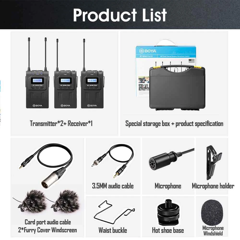 Система BY-WM8 Pro-K2 состоит из двух передатчиков, камеры-приемник с креплением и двух всенаправленных lavalier микрофонов. Также в комплект входит адаптер для крепления обуви, один выходной кабель 1/8 "-XLR, один выходной кабель 1/8-1/8", Чехол для переноски.