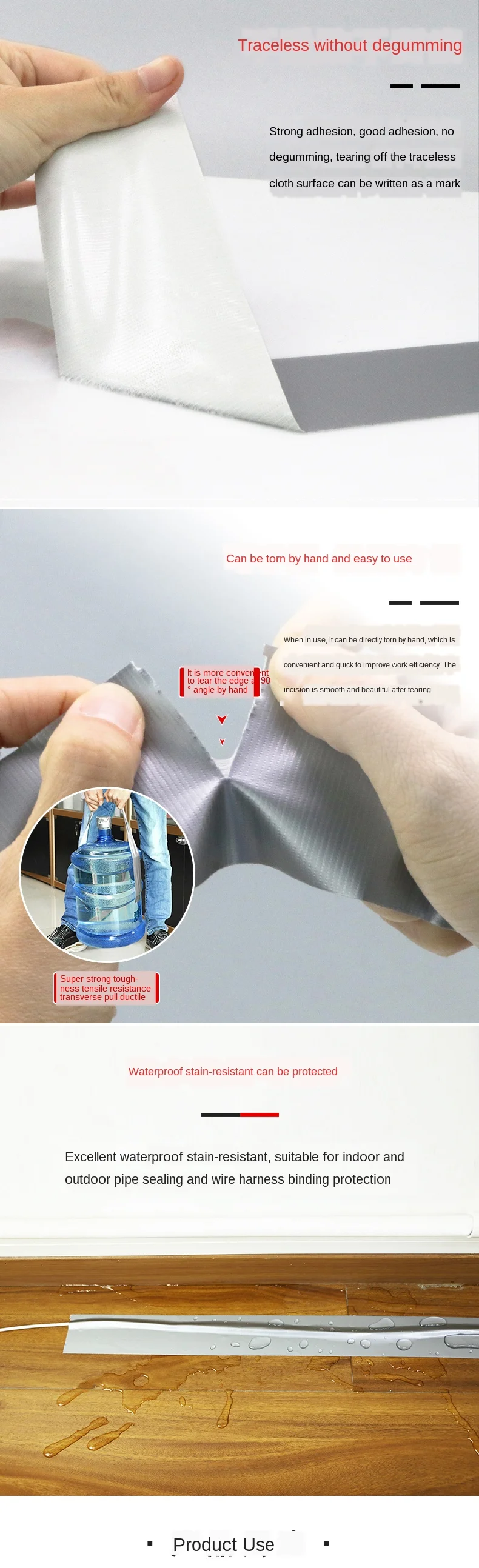 Характеристики продукта: высокая вязкость, долговечность, растягиваемость, легко разрывается, водонепроницаемость, маслостойкость и устойчивость к коррозии