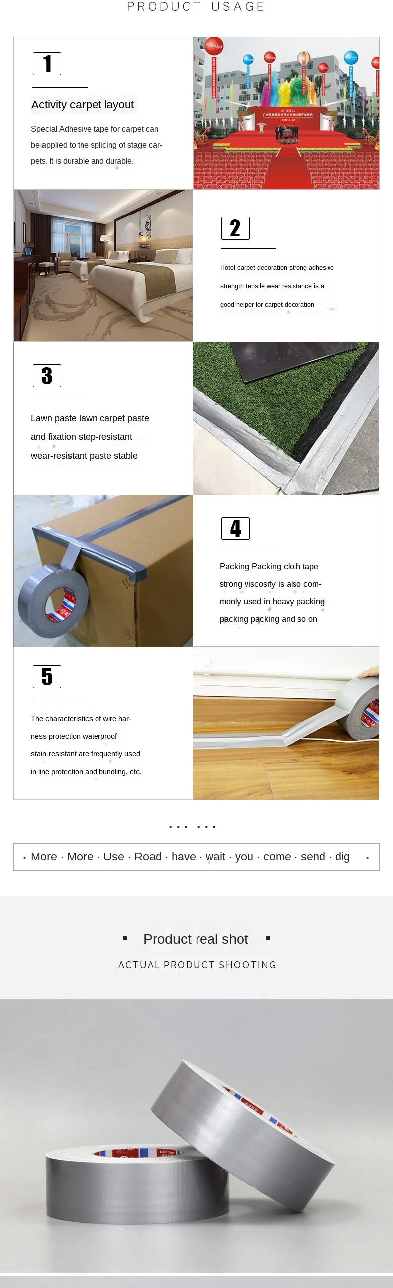 Использование продукта: он может быть широко использован в упаковке и обвязке, ковровой прошивке и прошивке, тяжелой обвязке, региональных разделениях, обмотке и обертывании нефтегазовых трубопроводов и т. д. Он часто используется в автомобильной промышленности, сценической компоновке, декоративной промышленности, электромеханической промышленности и повседневной жизни.