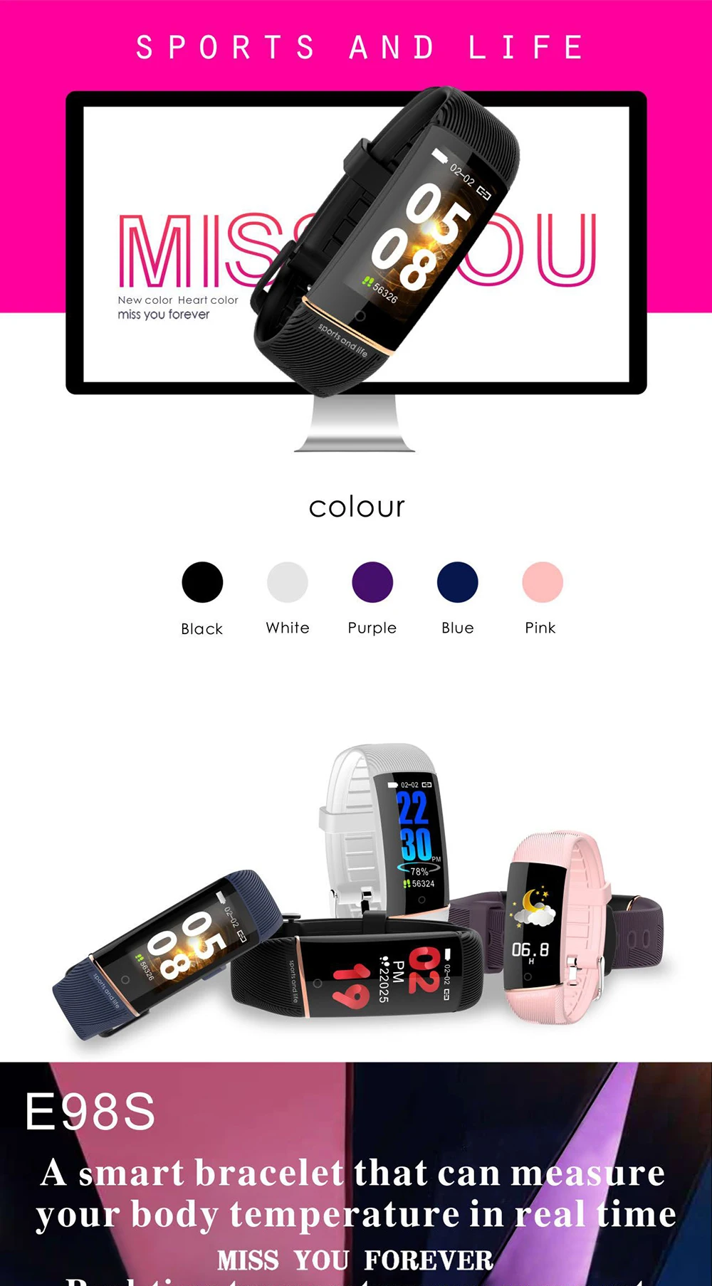 E98S Смарт-часы IP67 мужские и женские спортивные часы трекер сердечного ритма сна Мониторинг температуры умные браслеты фитнес-браслет
