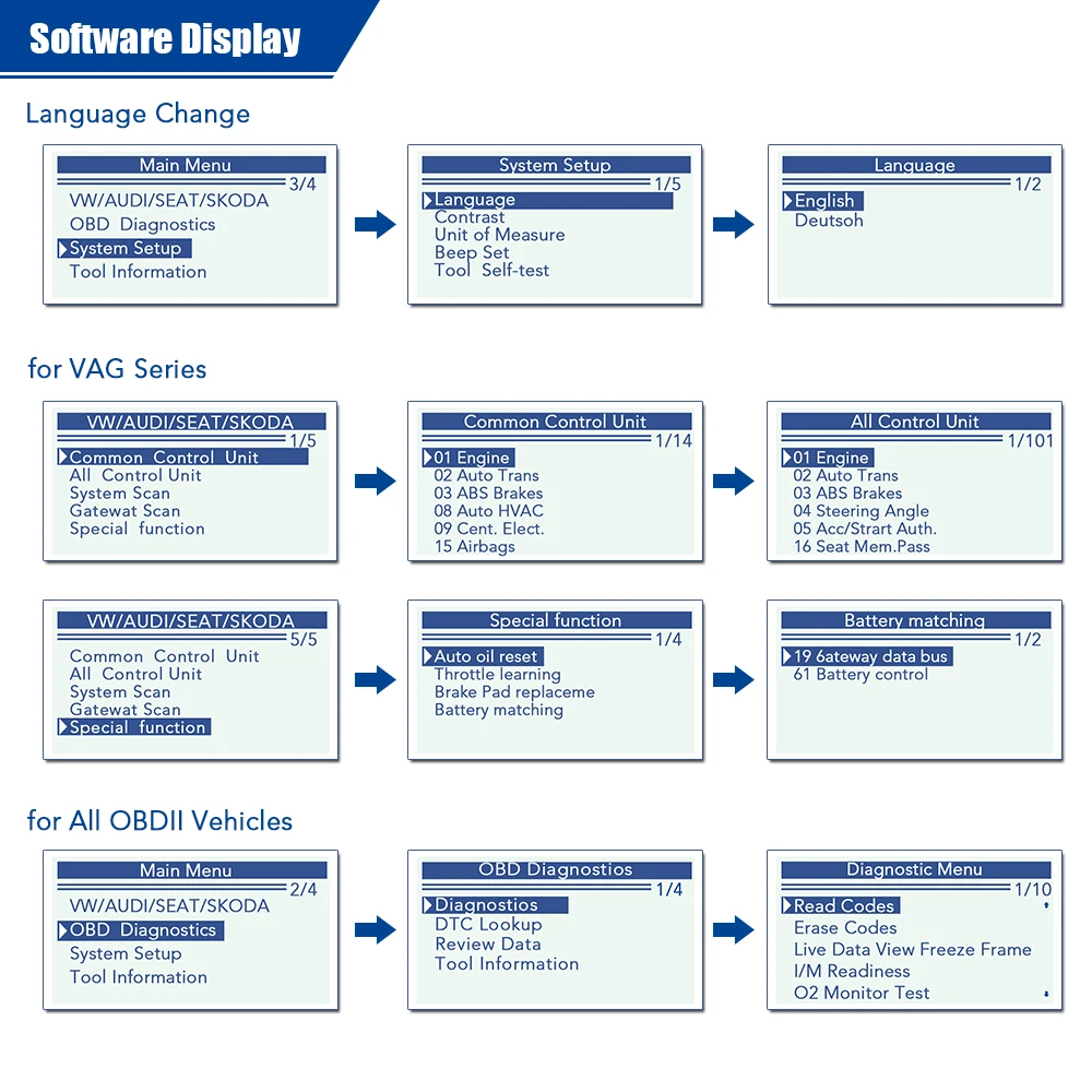 2. Специально разработан для пользователей VAG для выполнения специальных функций, таких как сброс освесветильник сервисного обслуживания масла (интервал обслуживания), EPB, TPS, для замены старой батареи.