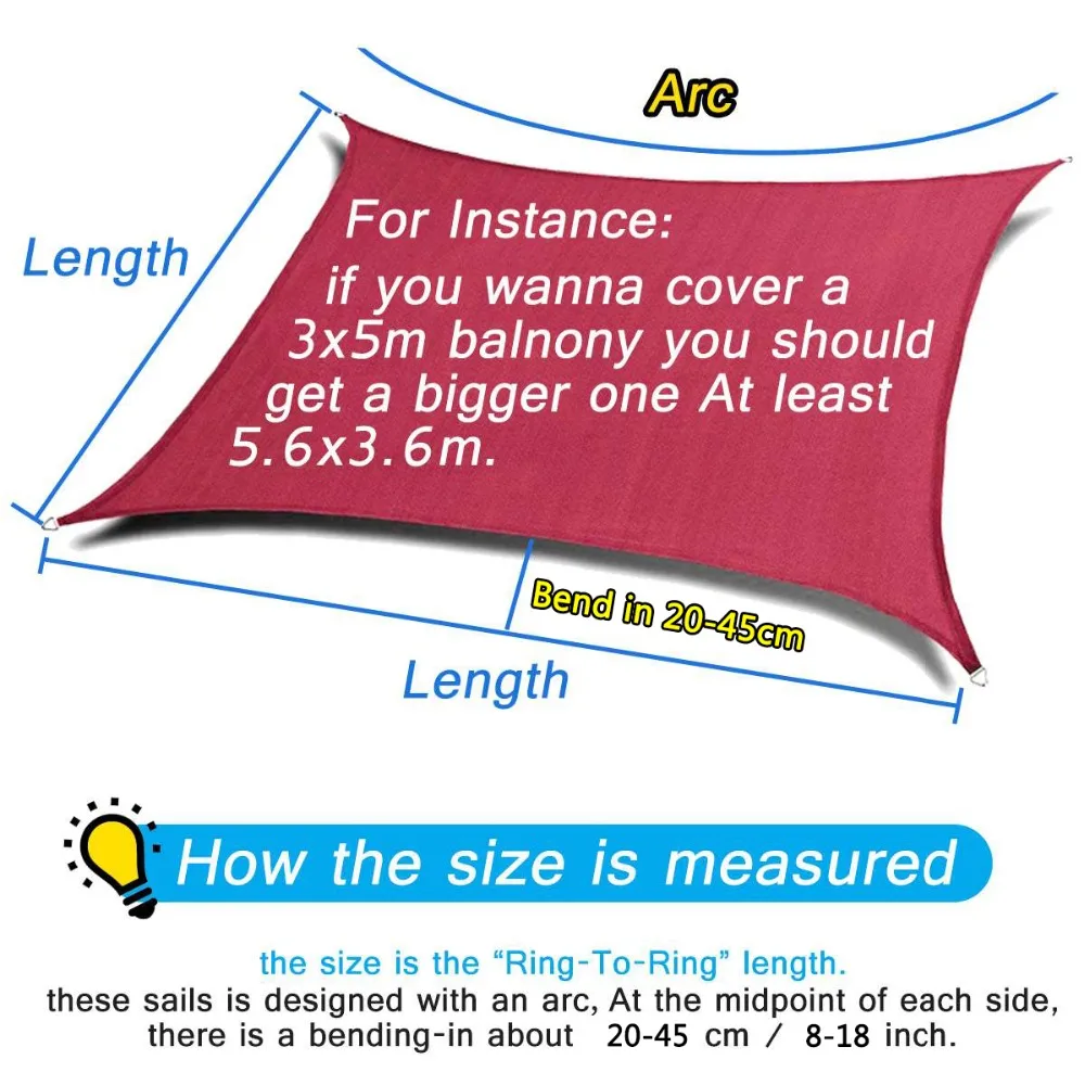 1.At the midpoint of each side, there is a bending-in about 20~45cm / 8~18inch. so for example,if you wanna cover a 1.5x3m balcony, you should get one at least 2x4m.