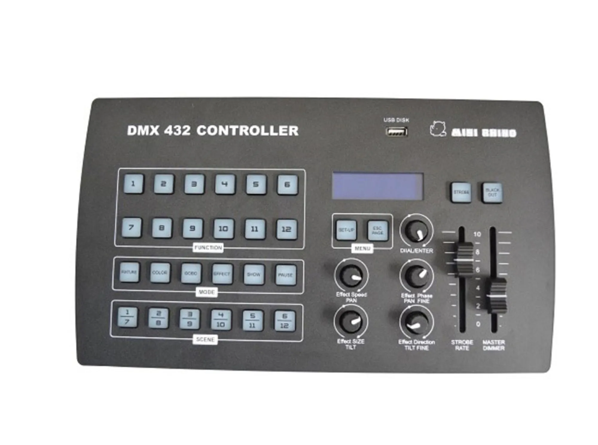 432 канальный DMX контроллер Контроль до 12 отдельных приспособлений 12 многофункциональных кнопок 12 воспоминаний через 2 банки 6 кнопок режима (приспособление, цвет, Gobo, эффект, шоу, пауза) Функция Master blackout Разъем USB (включая usb-диск) Защита паролем Мастер диммер управления фейдером Контроль скорости стробоскопа Входная мощность: 9 В постоянного тока 1000мА Размеры: 324 мм x 184 мм x 60 мм Чистая Вес: 1,8 кг