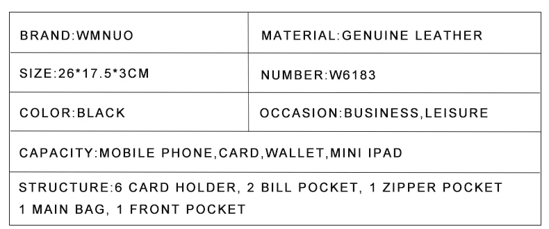 Наименование товара: брендовые клатчи Wmnuo, Мужская черная сумка-конверт с буквенным принтом, ручная сумка, кошелек из натуральной коровьей кожи для мужчин, клатч, деловой браслет Материал: Высококачественная коровья натуральная кожа Размер: 26*17,5*3 см Емкость: мобильный телефон, карта, кошелек, мини ipad Структура: 6 держатель для карт, 1 карман на молнии, 1 Основная сумка, 1 передний карман, 2 кармана для купюр Цвет: черный Примечание: 1. В связи с использованием различных методов измерения, возможны отклонения в размере от 1 до 3 см вследствие измерений вручную.(1 дюйм = 2,54 см; 1 см = 0,39 дюйма) 2. Из-за различных настроек монитора цвет изображения может немного отличаться от фактического цвета продукта.